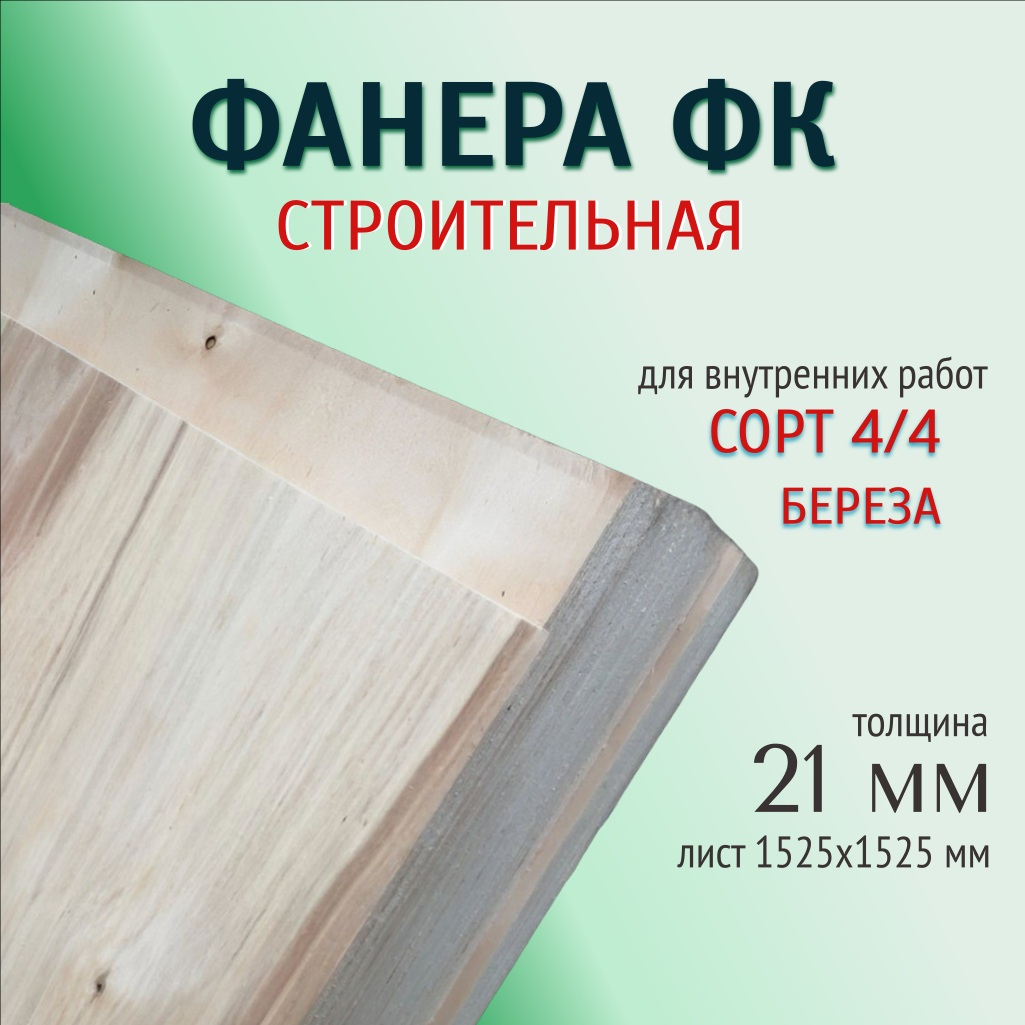 Фанера строительная ФК, сорт 4/4, береза, 21х1525x1525 мм, для внутренних работ в Москве