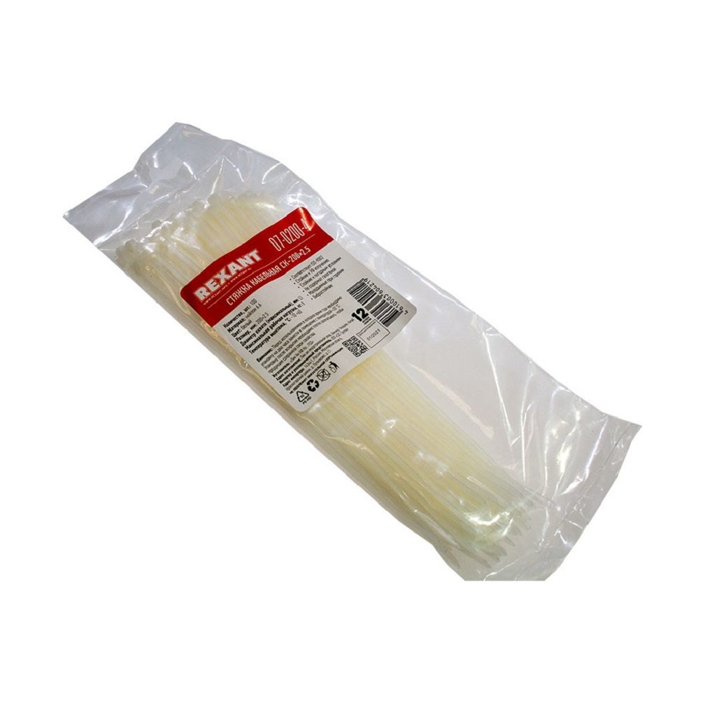 Стяжка кабельная Rexant 07-0200-4 нейлон 2.5х200 мм, упаковка 100 шт, белый