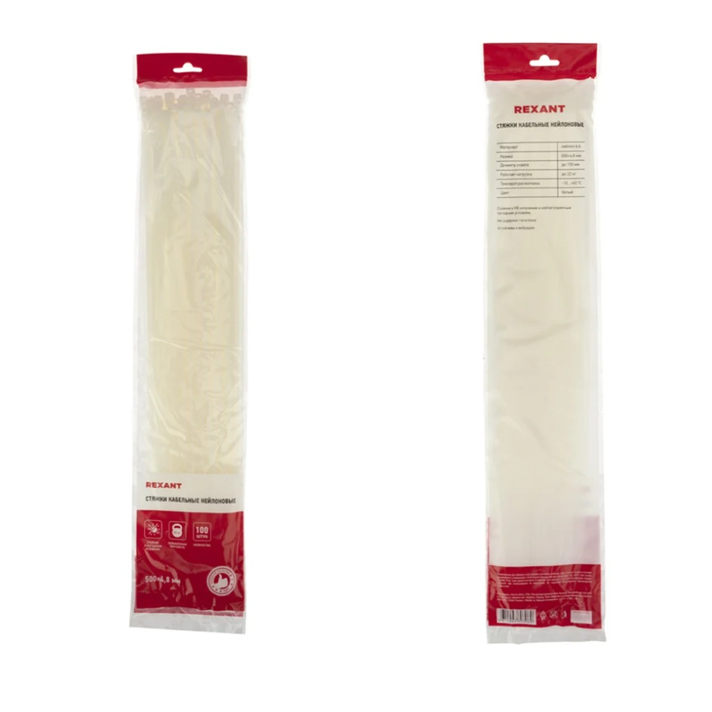 Описание стяжки Rexant 07-0500 нейлон, 4.8х500 мм, упаковка 100 шт, белый