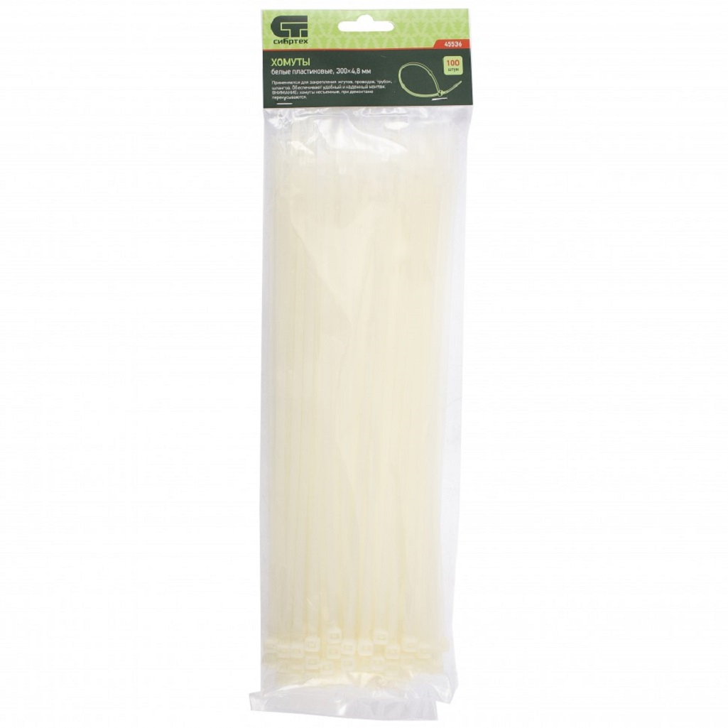 - Хомуты СИБРТЕХ пластиковые белые 4,8*300мм 100шт/уп