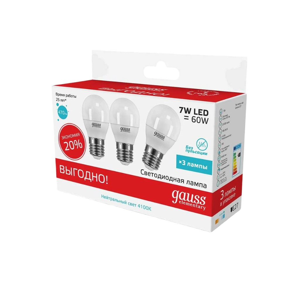 Описание лампы Шар Е27 7w 4100K 3в1 GAUSS Elementary