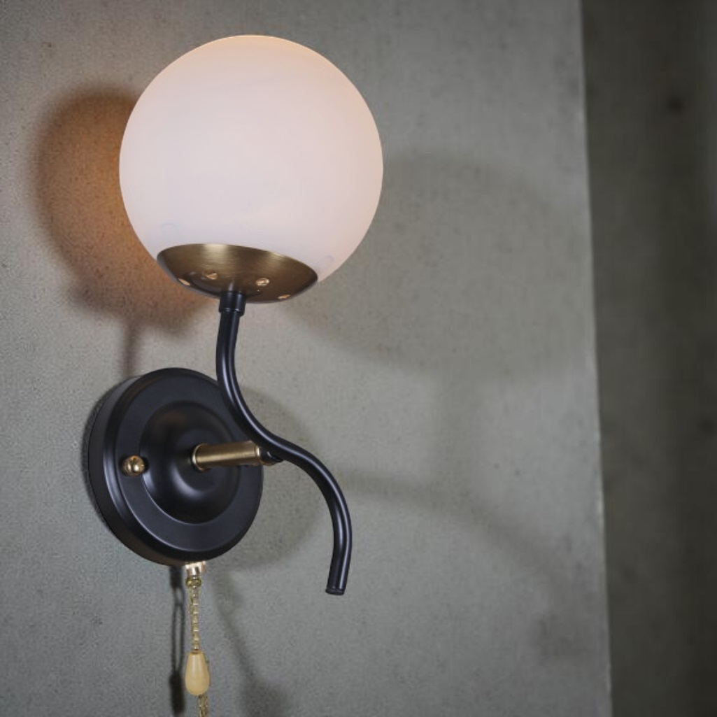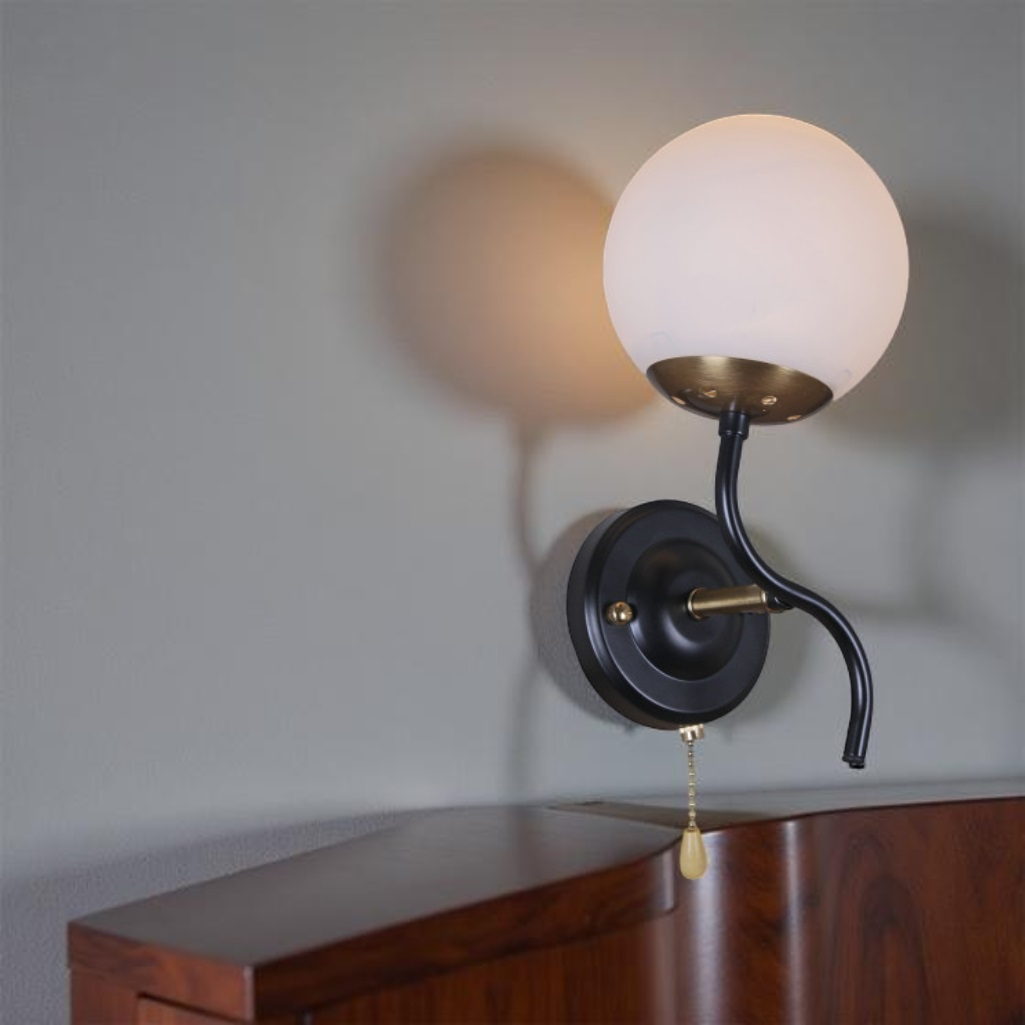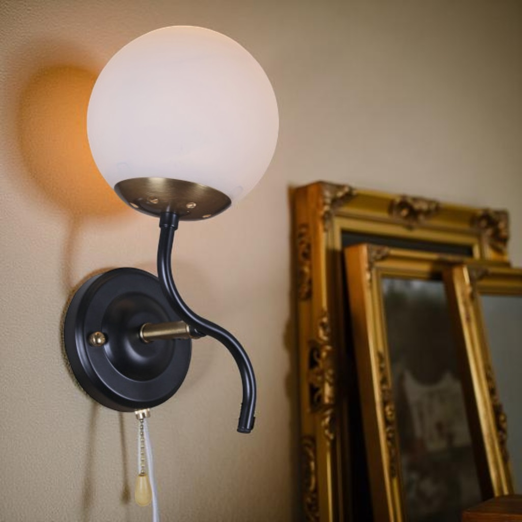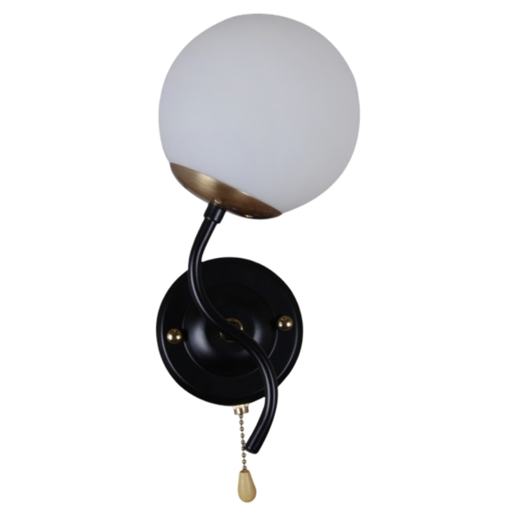 Бра Reluce 36364-0.2-01 BK+COP светильник настенный, 60 Вт, Е27, металл, стекло, черный с золотом предназначен для освещения площади до 3 кв.м. Этот светильник в современном стиле обратит на себя внимание ценителей всего оригинального. Светильник являет собой сочетание минимализма и утонченности, что проявляется в мощном основании, выполненном из металла классического черного цвета и стеклянном матовом белом плафоне. Созвучие фундаментальности и невесомости успешно дополняется витым элементом и изысканной цепочкой выключателя, которая завершается стильным наконечником в форме капли. Мощность светильника составляет 60 Вт, цоколь Е27. Надежность и безопасность изделия обеспечивается качественное исполнение и материалы. Бра Reluce36363-0.2-01 5038GD будет великолепно смотреться и единичным вариантом, и как группа светильников.