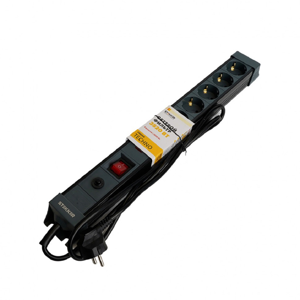 - Сетевой фильтр STEKKER 6-местный с/з 3x1мм2, 3м серия Techno HM22-61-03 черный