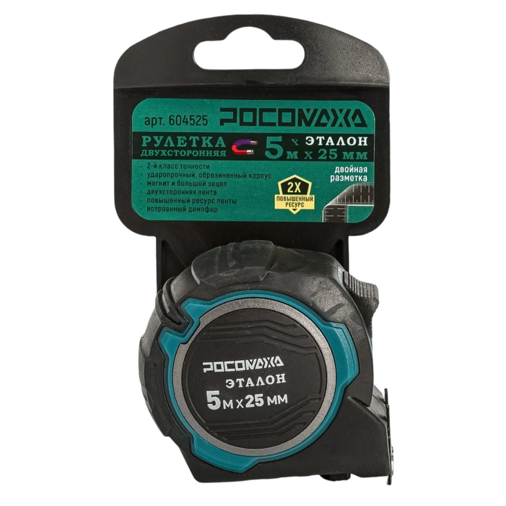 Рулетка двусторонняя Росомаха Эталон 604525, с устойчивой лентой и магнитом, 5 м х 25 мм предназначена для профессионального использования. Он помогает измерять поверхности и расстояния в ремонтных, строительных и других работах. Металлическая лента с защитным покрытием обеспечивает четкую разметку. Фиксатор надежно удерживает инструмент на нужной длине. Точность соответствует ГОСТу. Ударопрочный корпус из АБС-пластика выдерживает падения. Стальная лента прочная и не деформируется. Пружинный механизм рассчитан на долгий срок службы.