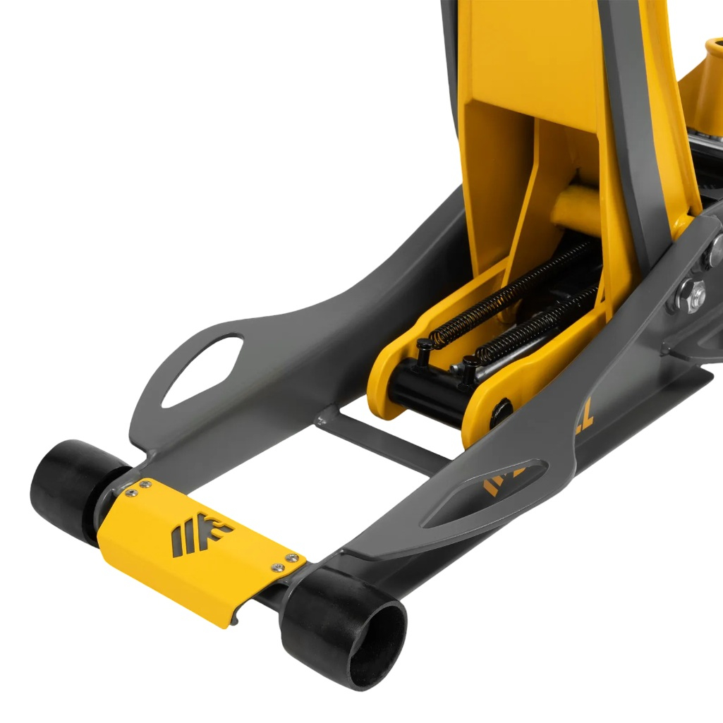 Для защиты от перегрузок предусмотрен предохранительный клапан, который не позволяет поднимать грузы массой более 3 тонн. Передние колеса домкрата оснащены масленками для смазки подшипников, что предотвращает заклинивание механизма при интенсивной работе. В специальный лоток для мелких деталей можно складывать болты и гайки. Резиновая опора и прорезиненная рукоятка защищают кузов и днище автомобиля от повреждений. Домкрат Denzel 51250 прошел тестирование с 25%-м превышением допустимой нагрузки, что подтверждает его высокое качество.