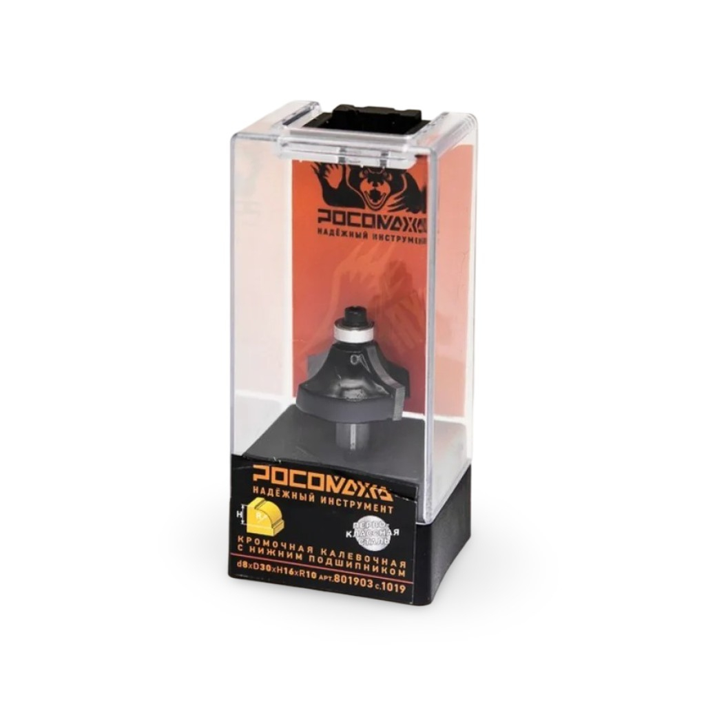 Фреза концевая Росомаха d8 мм, D30 мм, H16 мм, R10, кромочная с нижним подшипником, 801903 — это профессиональный инструмент для ручных фрезеров и станков, предназначенный для создания декоративной фигурной кромки (калевки) на деревянных деталях.