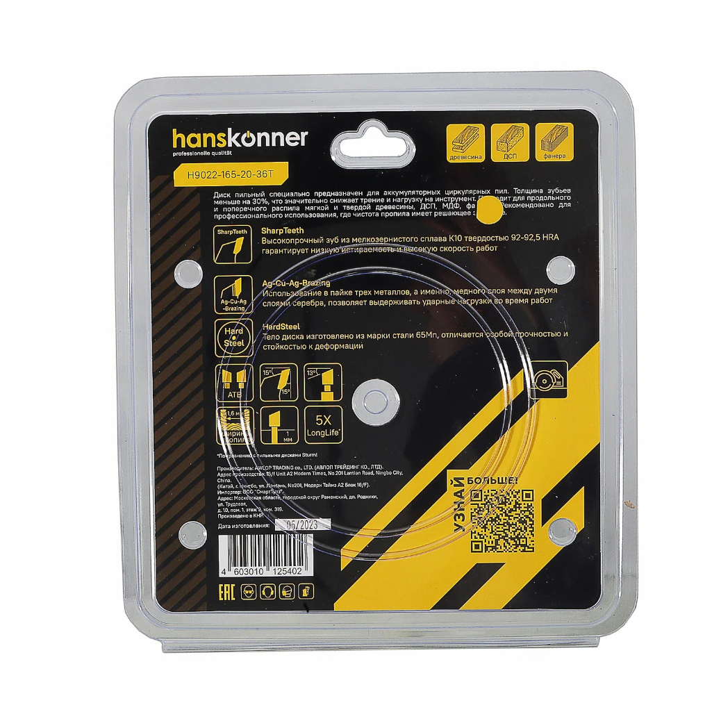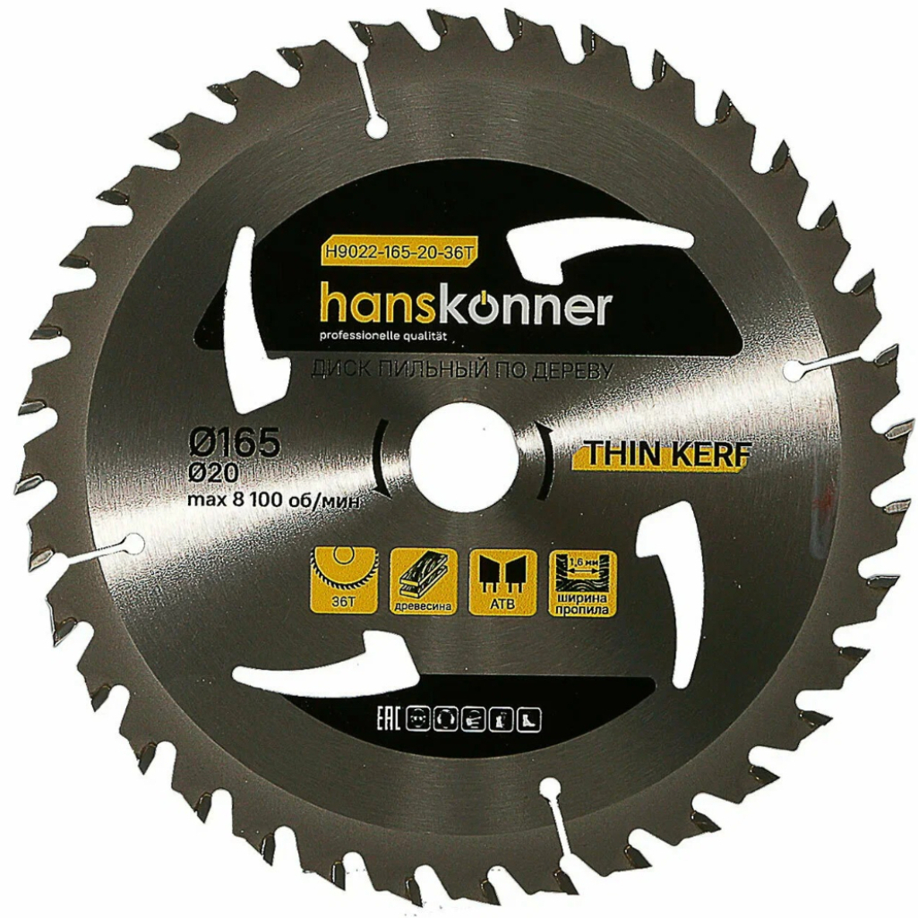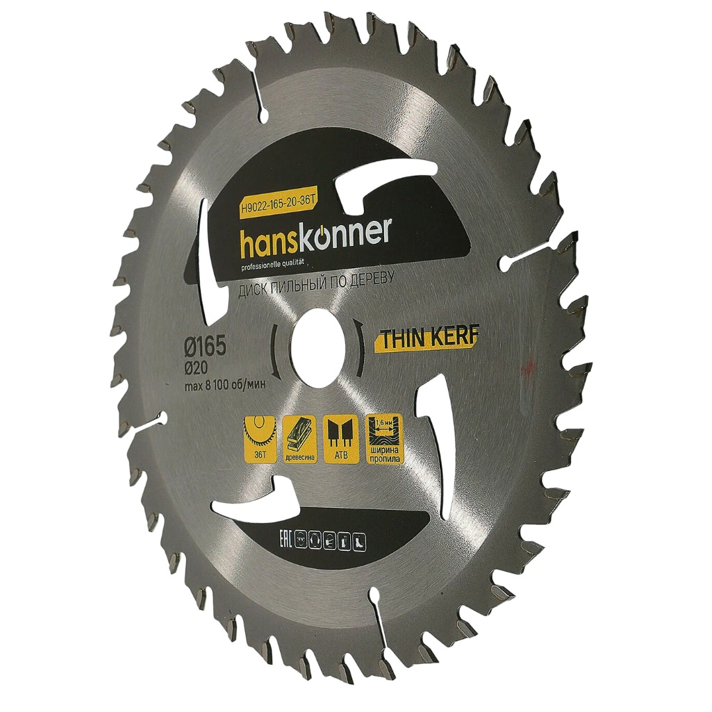 Описание диска по дереву Hanskonner THIN KERF H9022-165-20-36T, 165х20 мм, 36 зубьев