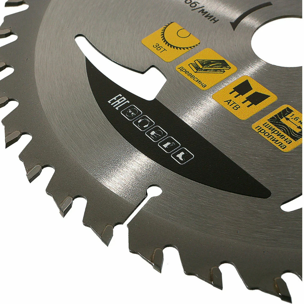 Зубья диска выполнены из твёрдого мелкозернистого сплава К10, что в 2,5 раза увеличивает его износостойкость. Это позволяет использовать диск в течение всего рабочего дня без перегрева. Тело диска изготовлено из прочной стали марки 65Mn, которая гарантирует его долговечность. Характеристики диска: диаметр 165 мм, толщина тела 1 мм, толщина реза 1,6 мм, количество зубьев 36.