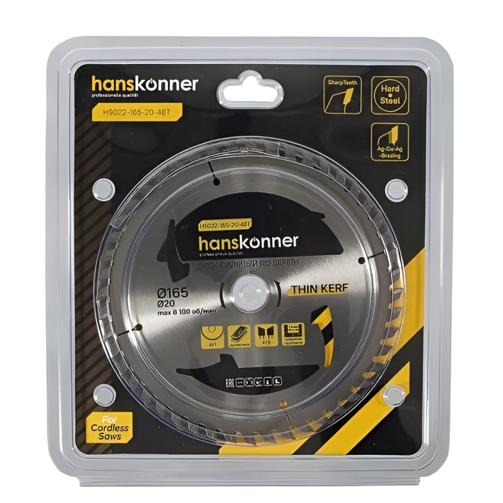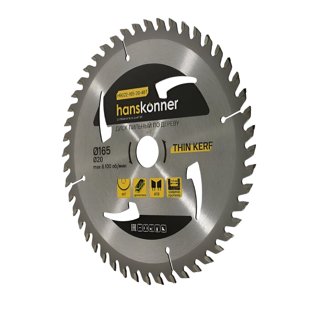 Описание диска по дереву Hanskonner THIN KERF H9022-165-20-48T, 165х20 мм, 48 зубьев