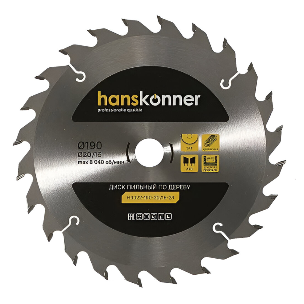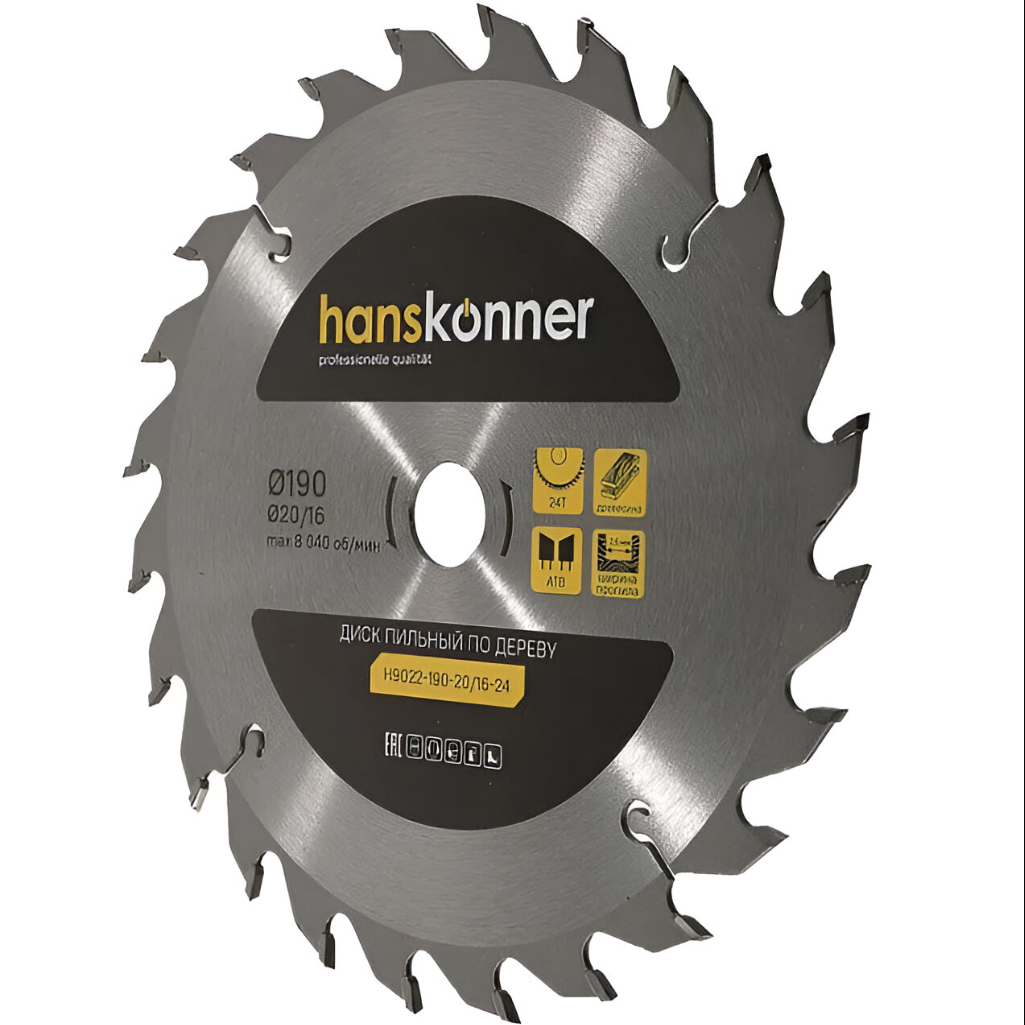 Описание диска по дереву Hanskonner H9025-190-20/16-24T, 190х20/16, 24 зубья