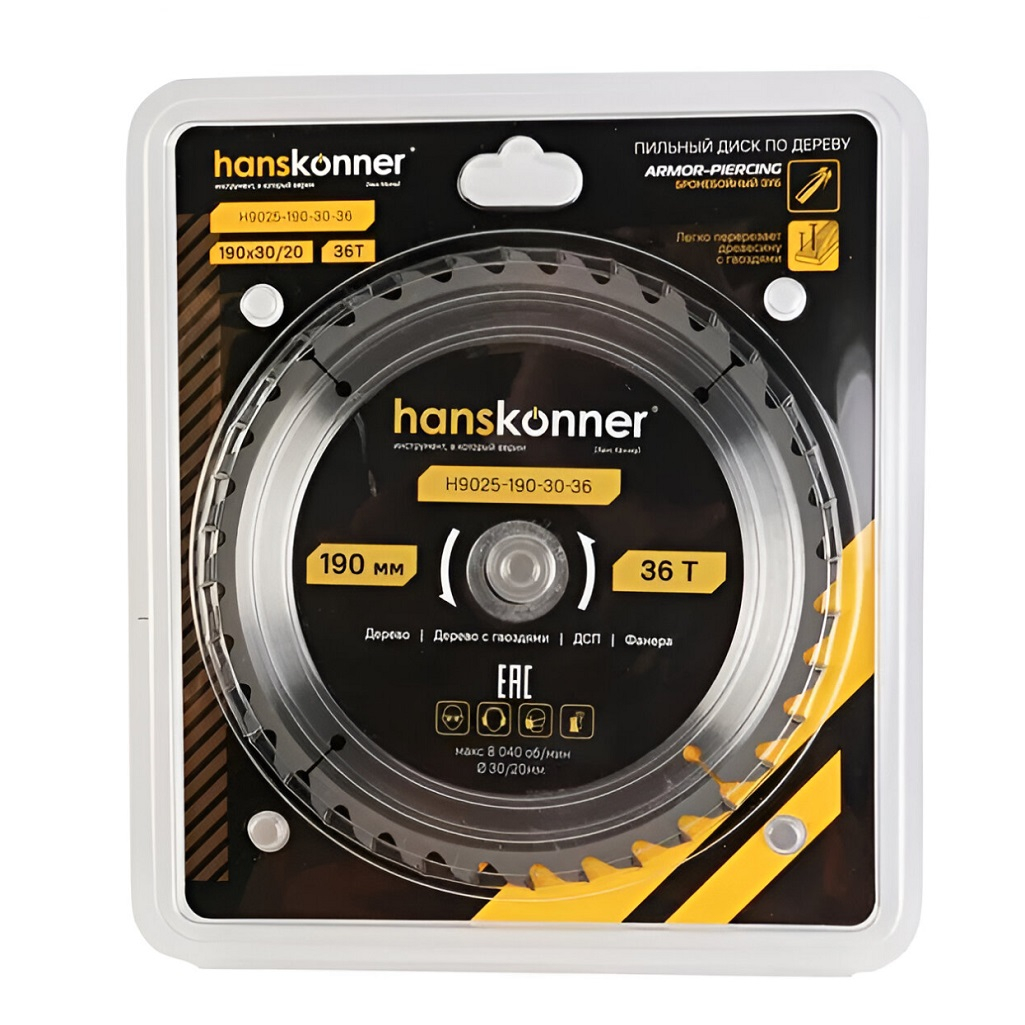 Диск пильный по дереву Hanskonner ArmorPiercing H9025-190-30/20-36T, 190x30/20мм, 36 зубьев