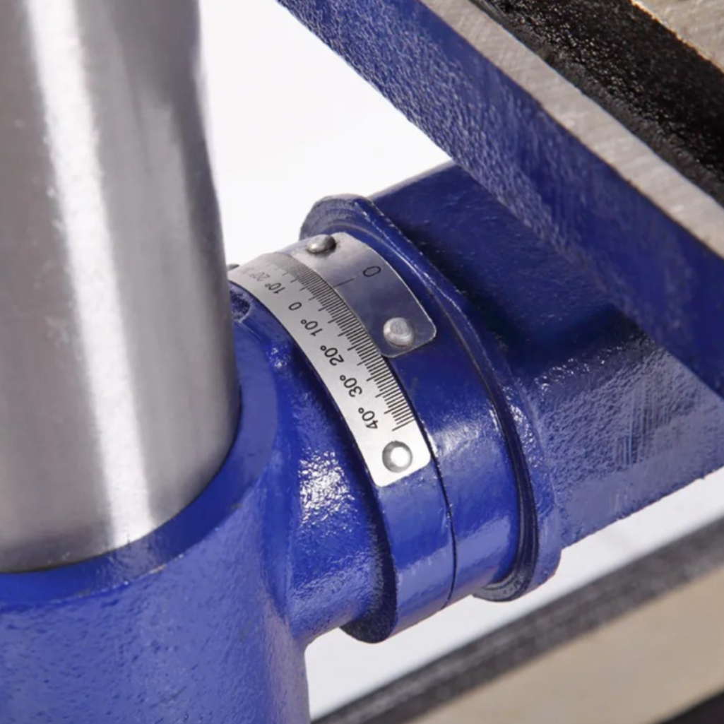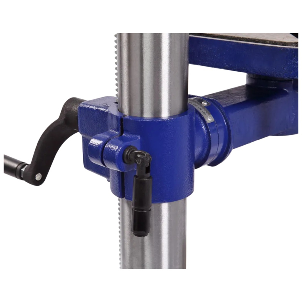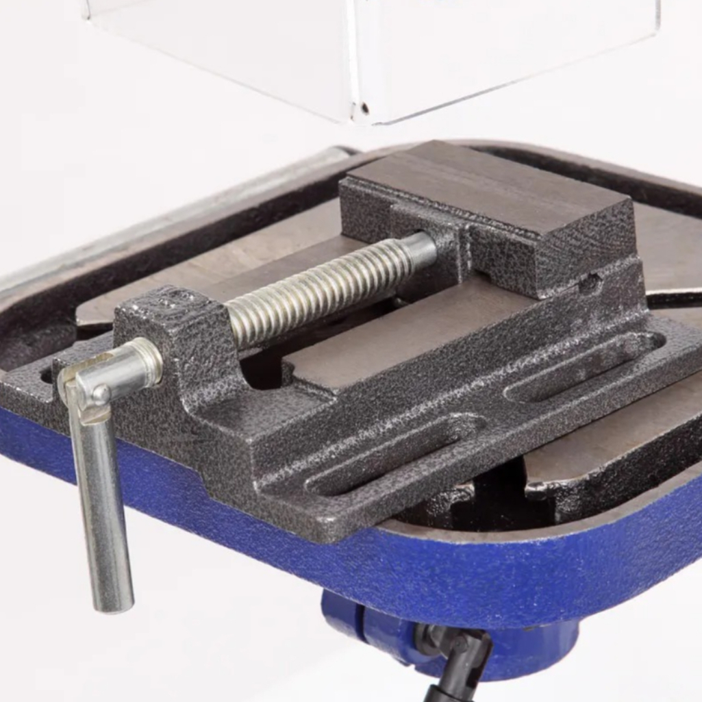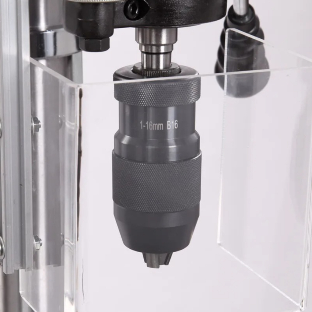 Заготовку можно закрепить как на рабочем столе, так и на основании, в зависимости от её размера. Максимальная нагрузка на стол составляет 10 килограммов, а допустимое отклонение стола 0,35 мм. В комплекте со станком поставляются тиски. Для их крепления предусмотрены 4 паза на рабочем столе и 2 на основании. Шкала, отображающая ход пиноли шпинделя, находится слева от панели управления. Возможно ограничение хода пиноли с помощью стопора, перемещаемого по планке. Рукоять имеет удобную форму, что обеспечивает плавную подачу сверла к заготовке. Максимальный ход пиноли шпинделя составляет 90 мм. Патрон быстрозажимной, с максимальным диаметром зажимаемого хвостовика инструмента 16 мм. Диаметр стойки 60 мм. Зубчатая рейка позволяет регулировать поднятие и опускание стола с помощью рукоятки.