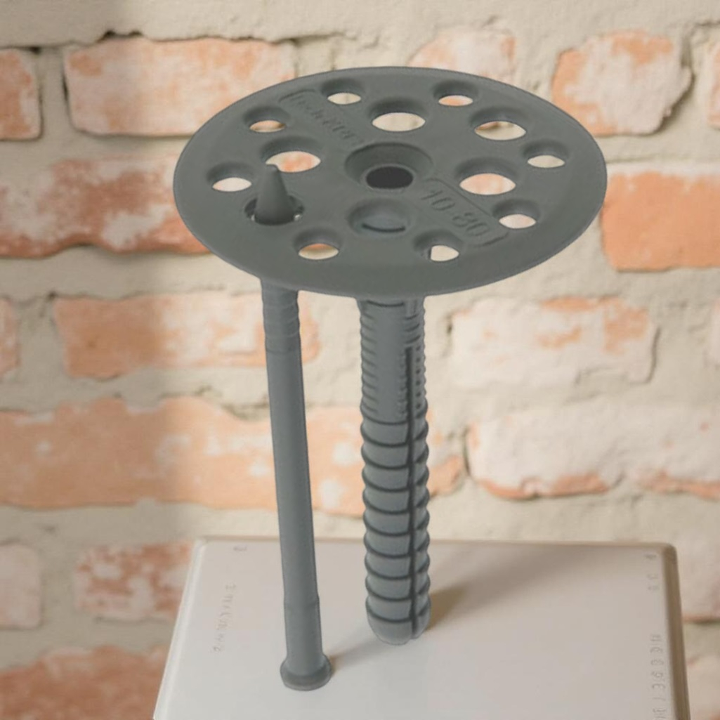 Дюбели с пластиковым гвоздем предназначены для крепления теплоизоляционных материалов к несущим основаниям из бетона, блоков и кирпича. Установка дюбеля производится с помощью молотка методом сквозного монтажа в предварительно просверленное и очищенное от пыли отверстие. Основание дюбеля изготовлено из высококачественного полипропилена, который выдерживает значительные нагрузки и удары. Гвоздь также выполнен из ударопрочного полипропилена. Специальная конструкция поверхности диска обеспечивает оптимальное нанесение штукатурки и упрощает процесс выравнивания.
