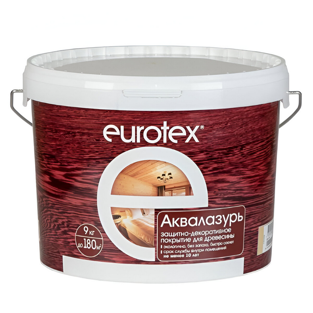 Защитно-декоративное покрытие Eurotex Аквалазурь для древесины, полуглянцевый блеск, Белый, 9 кг предназначено для обработки как внутренних, так и наружных деревянных поверхностей. Оно идеально подходит для новых и старых (неокрашенных или очищенных от старого покрытия) деревянных материалов, таких как ДВП, ДСП, фанера, MDF, OSB и клееный брус. Продукт также может использоваться для минеральных поверхностей, включая кирпич, бетон и декоративную штукатурку.