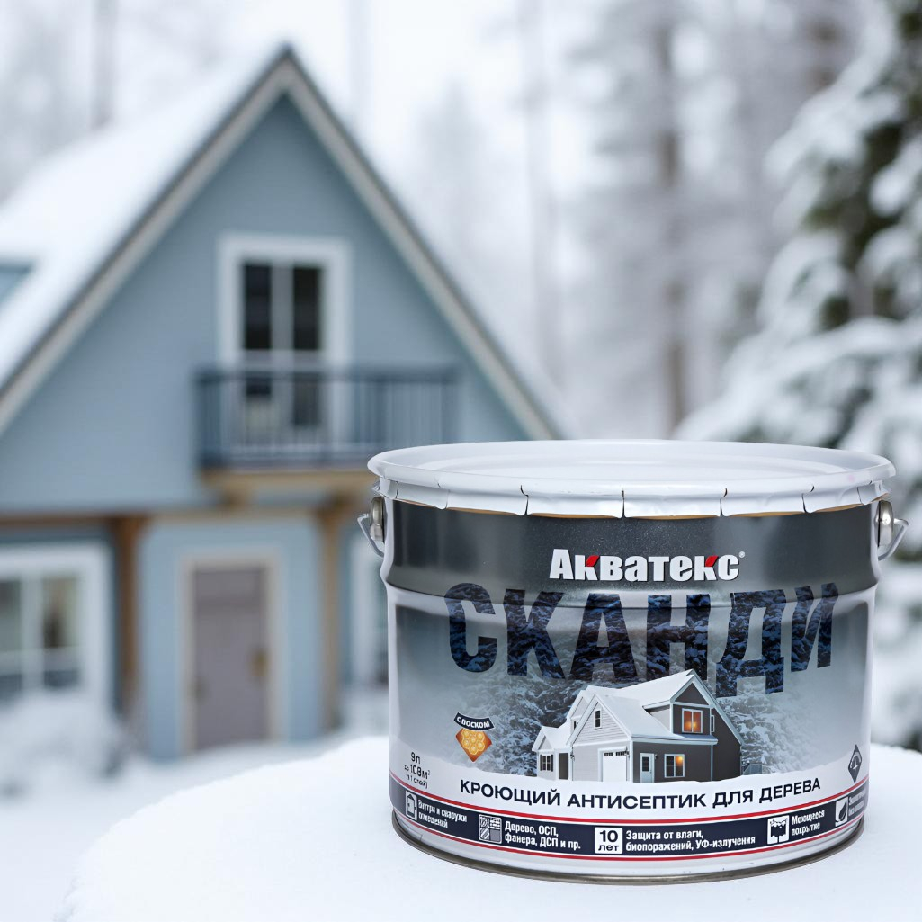 Антисептик Акватекс Сканди для дерева, кроющий, полуматовое покрытие, Альпийское утро, 9 л - это идеальное решение для защиты и декоративной обработки древесины. Продукт обеспечивает плотное кроющее покрытие, которое скрывает рисунок, но сохраняет видимой текстуру древесины. Он предназначен для защиты от влаги, биопоражений, таких как гниение, плесень и грибок, а также от УФ-излучения и других атмосферных воздействий.