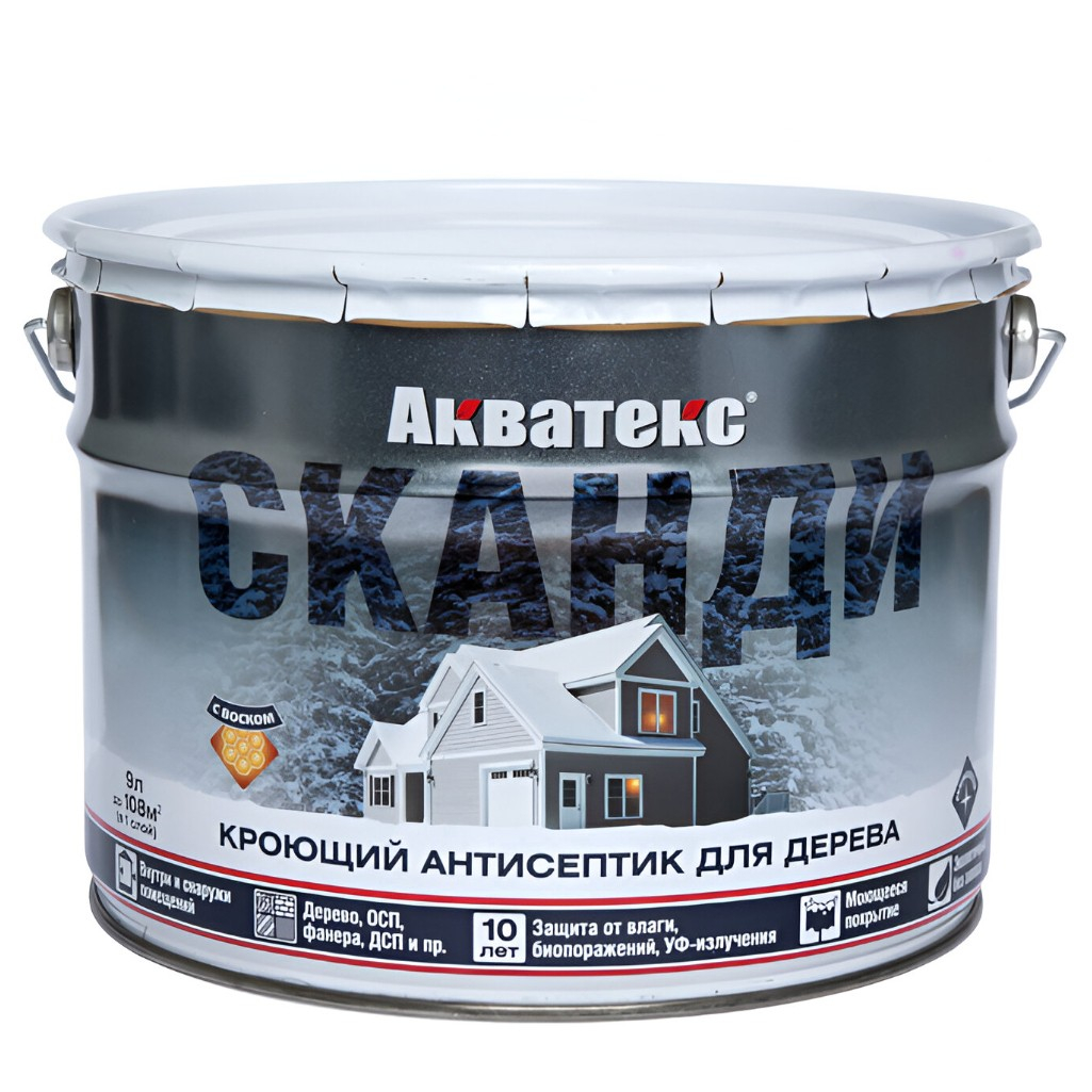 Антисептик Акватекс Сканди для дерева, кроющий, полуматовое покрытие, Топленое молоко, 9 л предназначен для декоративной и защитной обработки древесины. Создавая полуматовое кроющее покрытие, он сохраняет видимую структуру древесины, надежно защищая ее от влаги, биопоражений, УФ-излучения и других неблагоприятных атмосферных воздействий.
