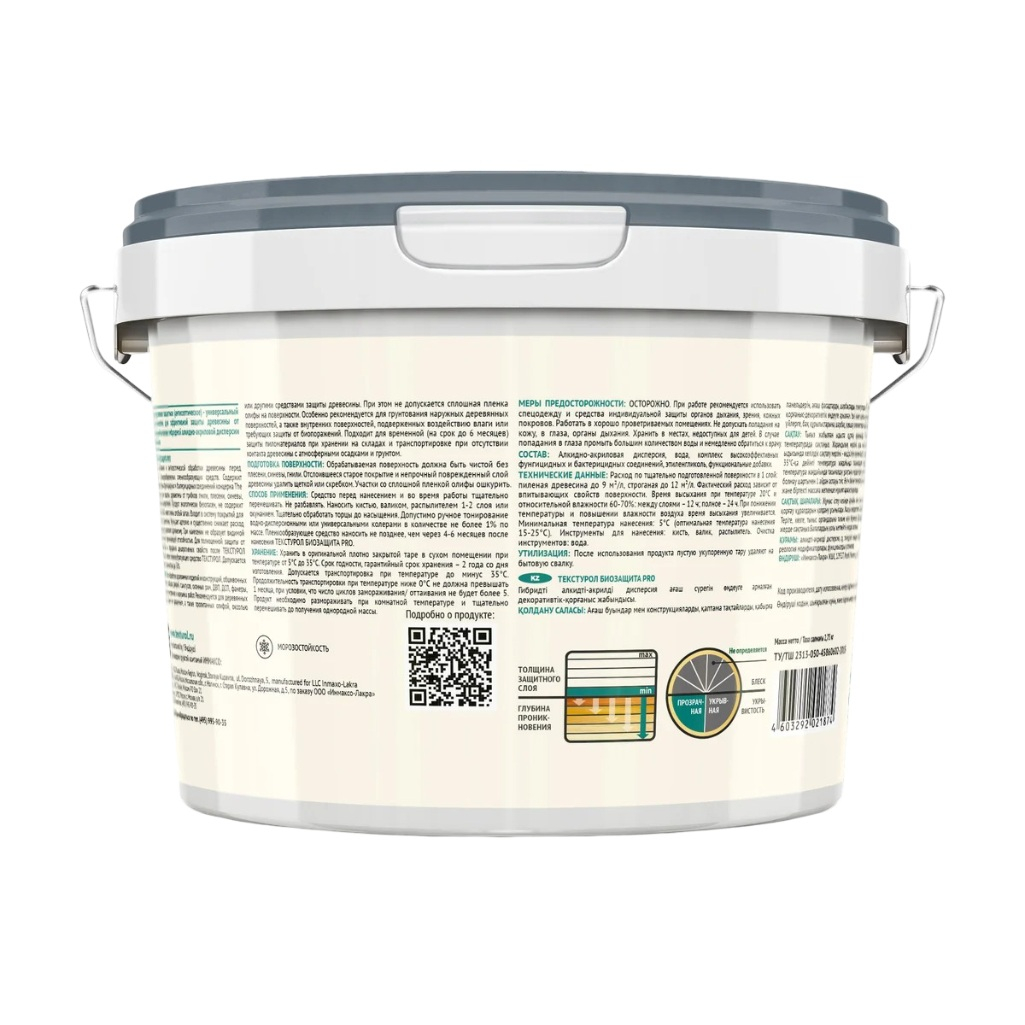 Грунт-антисептик Текстурол Биозащита PRO средство защитное для древесины, 2.7 л - это глубоко проникающий антисептический грунт для деревянных изделий и конструкций, таких как обшивочные доски, стеновые панели, заборы, плинтусы, двери, оконные рамы, ДВП, ДСП, фанера и шпон, перед нанесением финишных средств Текстурол. Состав обеспечивает защиту от гнили, плесени, синевы и водорослей, распространенных по всей территории России. Экологически безопасен, не содержит органических растворителей и имеет слабый запах. Увеличивает адгезию, значительно снижает расход последующих материалов и укрепляет древесину. Образует невидимую пленку и обладает отличной проникающей способностью. Грунт-антисептик применяется для грунтования и антисептической обработки древесины перед нанесением водо- и органоразбавляемых финишных покрытий. Содержит комплекс фунгицидных и бактерицидных компонентов от The Dow Chemical Company, защищающих древесину от грибков, гнили, плесени, синевы, водорослей и насекомых. Особенно рекомендуется для наружных деревянных поверхностей и внутренних, подверженных влаге. Подходит для временной защиты пиломатериалов (до 6 месяцев) при хранении и транспортировке, если древесина не контактирует с атмосферными осадками и грунтом. Можно наносить на древесину влажностью до 30%. Время высыхания составляет 12 часов между слоями, 24 часа для полного высыхания.