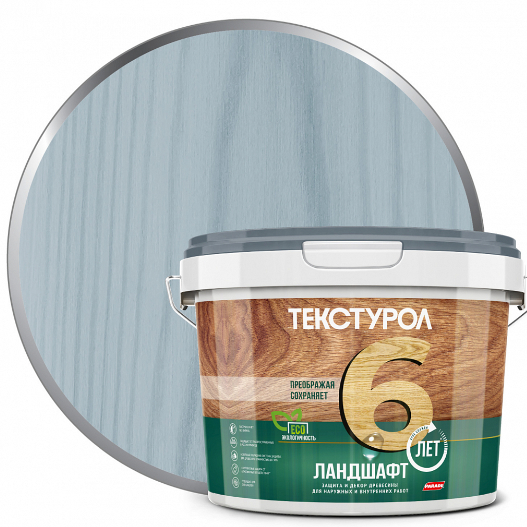 Пропитка Текстурол Ландшафт, защита и декор древесины, с воском, Дымчато-голубой, 2.5 л   - это средство защиты, созданное на водной основе. Оно сочетает в себе декоративные и защитные свойства, обладает высокой укрывистостью и подходит как для внутренних, так и для наружных работ. Предназначено для отделки деревянных изделий и конструкций, включая обшивочные доски, стеновые панели, фасады, заборы, плинтусы, древесно-волокнистые и древесно-стружечные плиты, фанеру и шпон. Рекомендуется для использования в деревянных домах, садовых постройках и заборах. Создает шелковисто-матовое покрытие, которое подчеркивает текстуру древесины, при этом обладает высокой укрывистостью. Благодаря тиксотропности, состав легко и экономично наносится, без подтеков и разбрызгивания. Можно применять на древесине с влажностью до 30%.