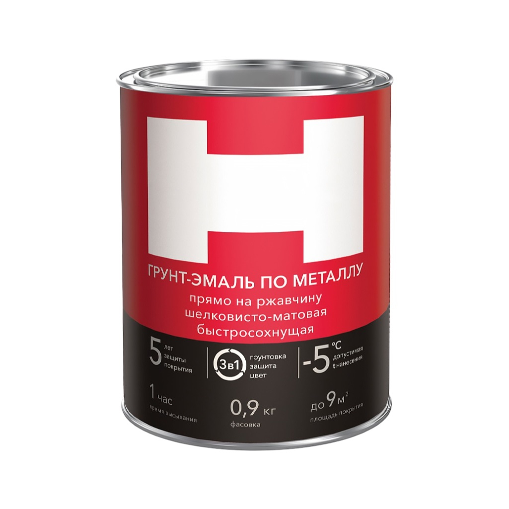 Грунт-эмаль H по металлу, 3 в 1, быстросохнущая шелковисто-матовая красная 0.9 кг - это инновационное решение для защиты и декорирования металлических поверхностей. Сочетая в себе функции преобразователя ржавчины, антикоррозионного грунта и декоративной эмали, данное средство позволяет наносить его прямо на ржавчину, создавая надежное защитное покрытие.