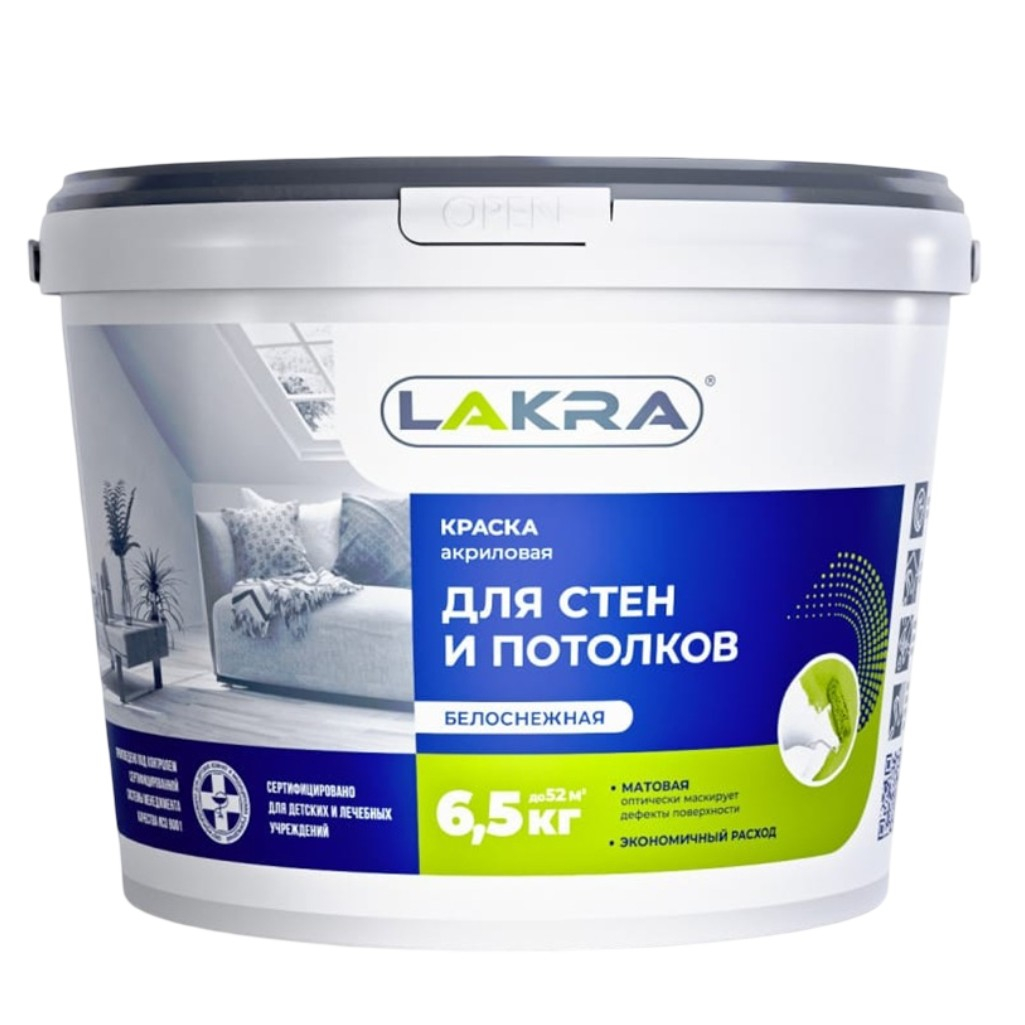 - Краска ЛАКРА акриловая для стен и потолков белоснежная 6,5кг
