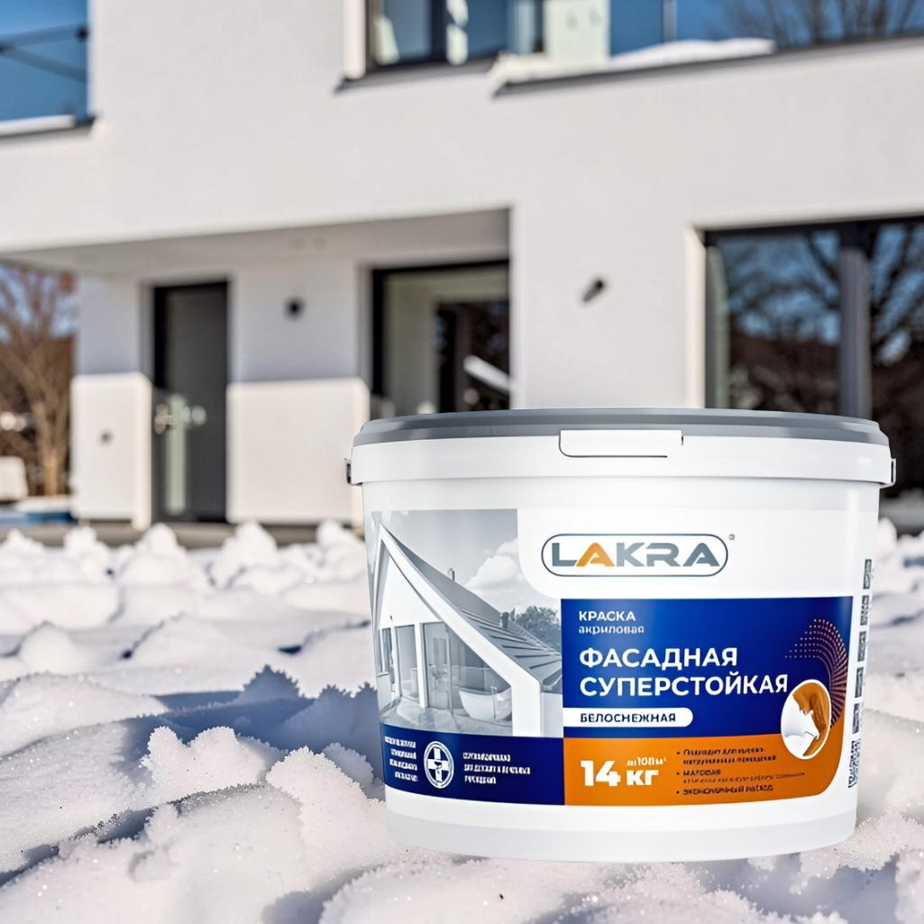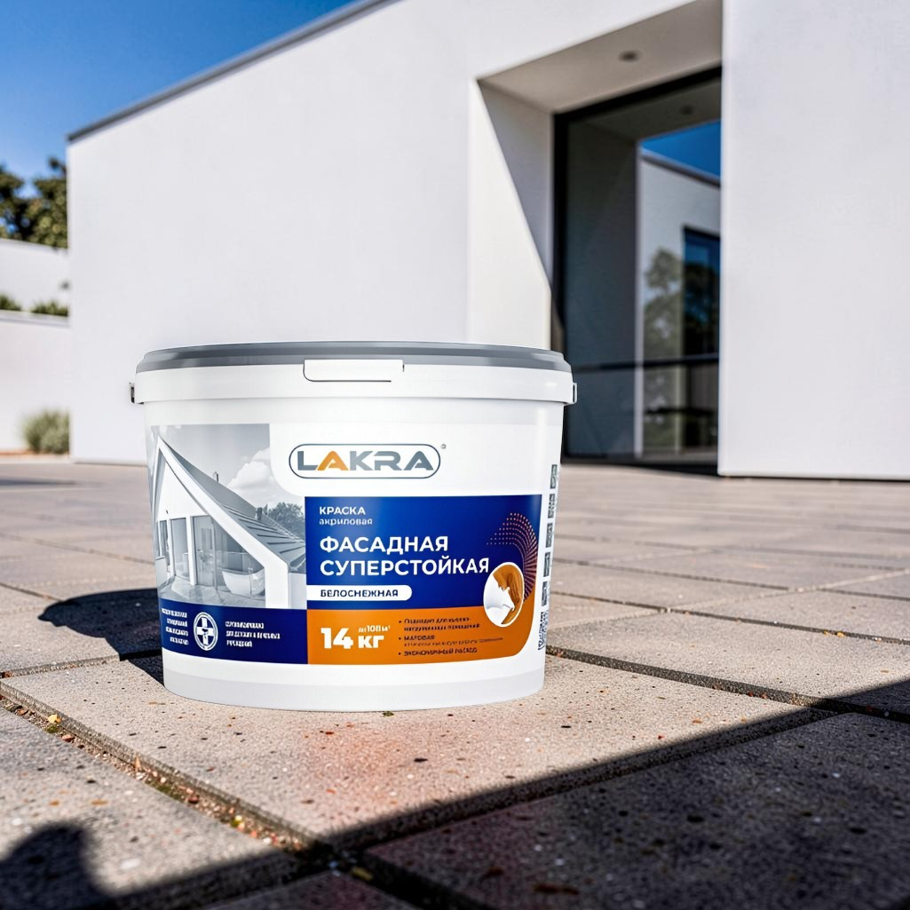 - Краска ЛАКРА акриловая, фасадная, суперстойкая, белоснежная 14кг