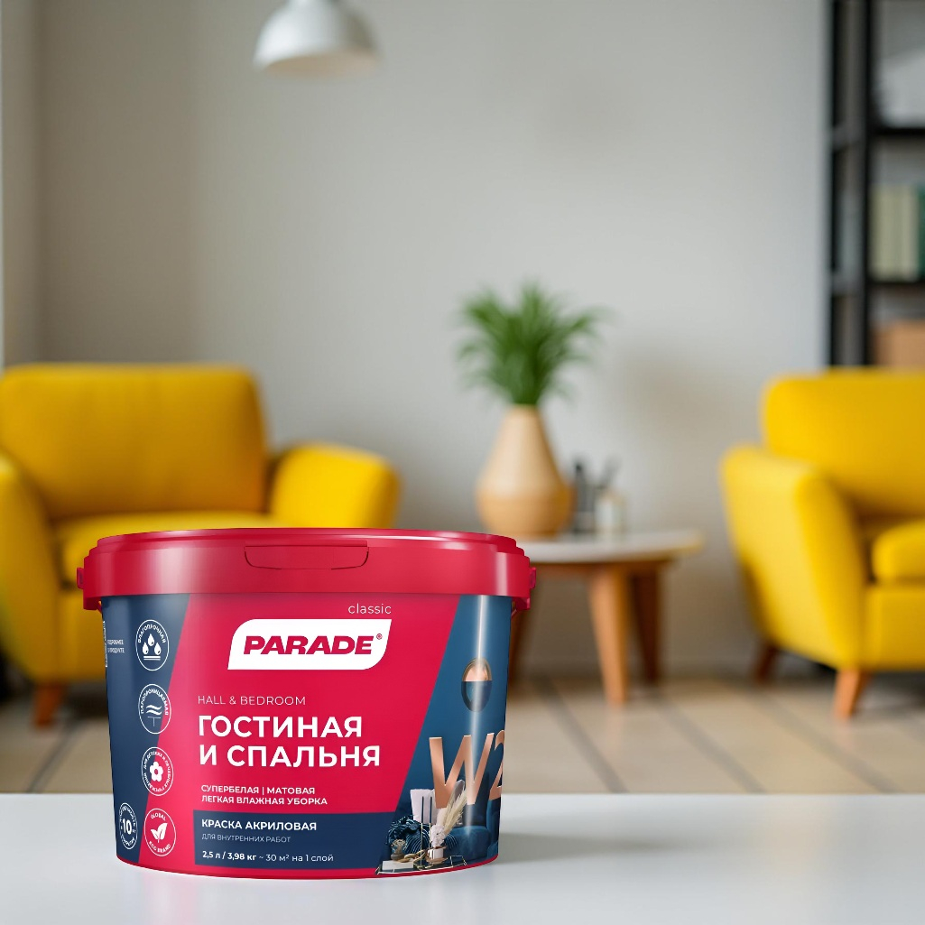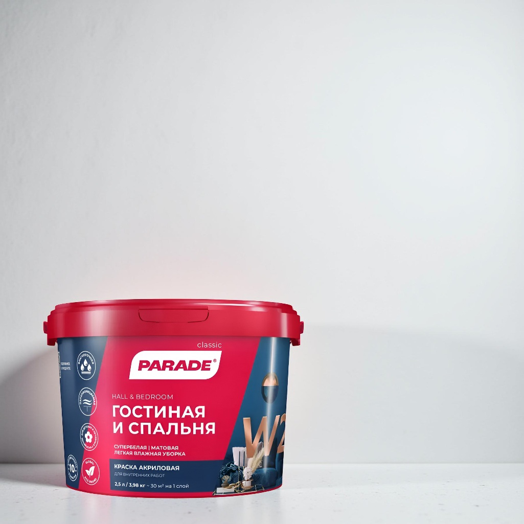 Описание краски PARADE classic Гостиная и спальня W2 супербелая матовая, 2.5 л