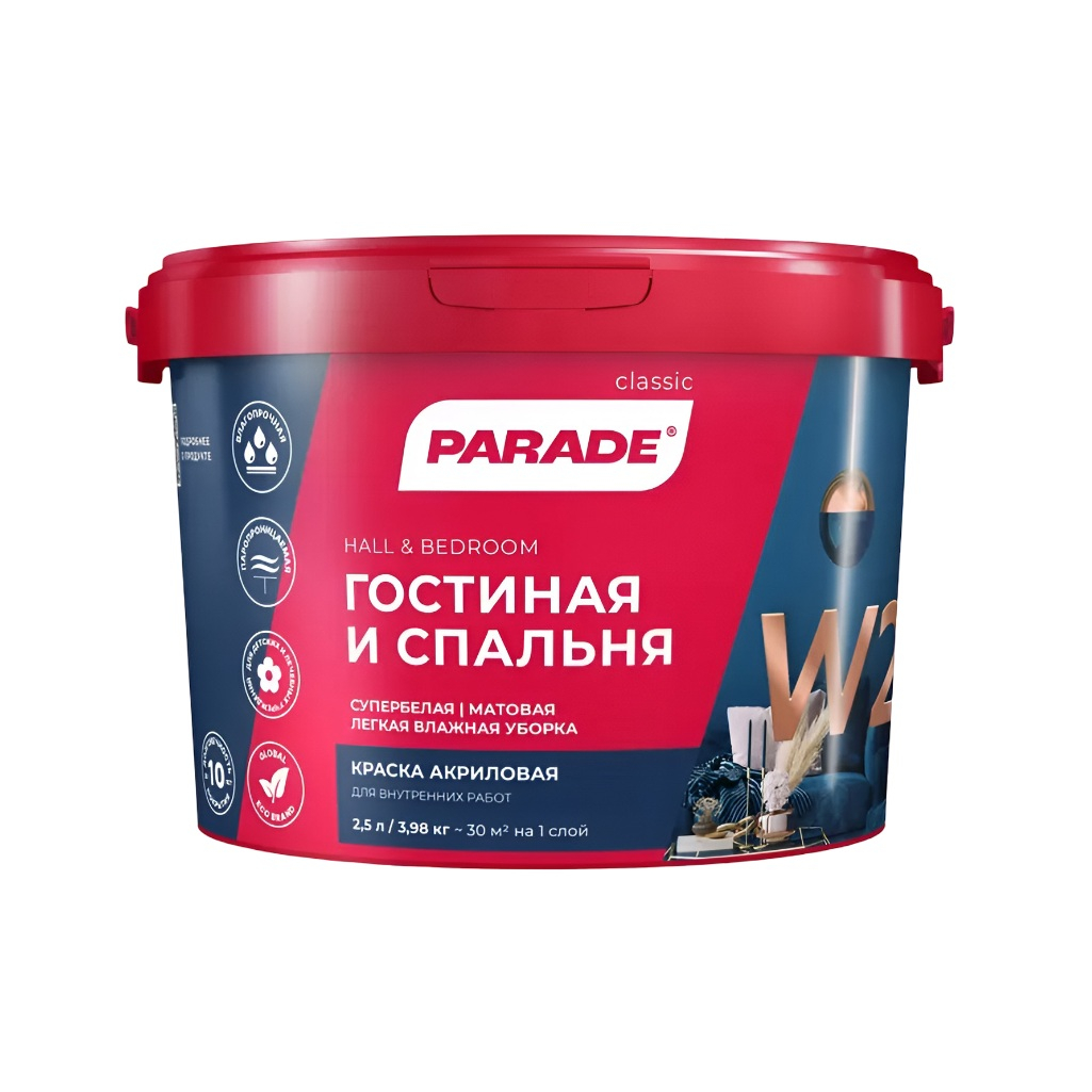 Технические характеристики краски PARADE classic Гостиная и спальня W2 супербелая матовая, 2.5 л