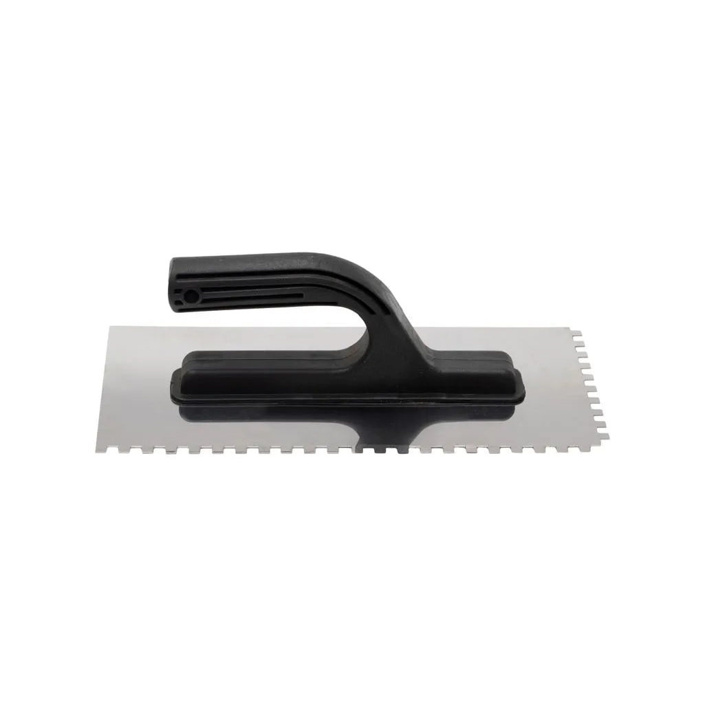 Нержавеющая зубчатая гладилка с пластиковой ручкой 280х130 мм зуб 6х6 мм Кедр обладает оптимальными размерами для эффективной укладки плитки. Зубчатая сторона выравнивает клеевой состав, что делает процесс укладки более простым.