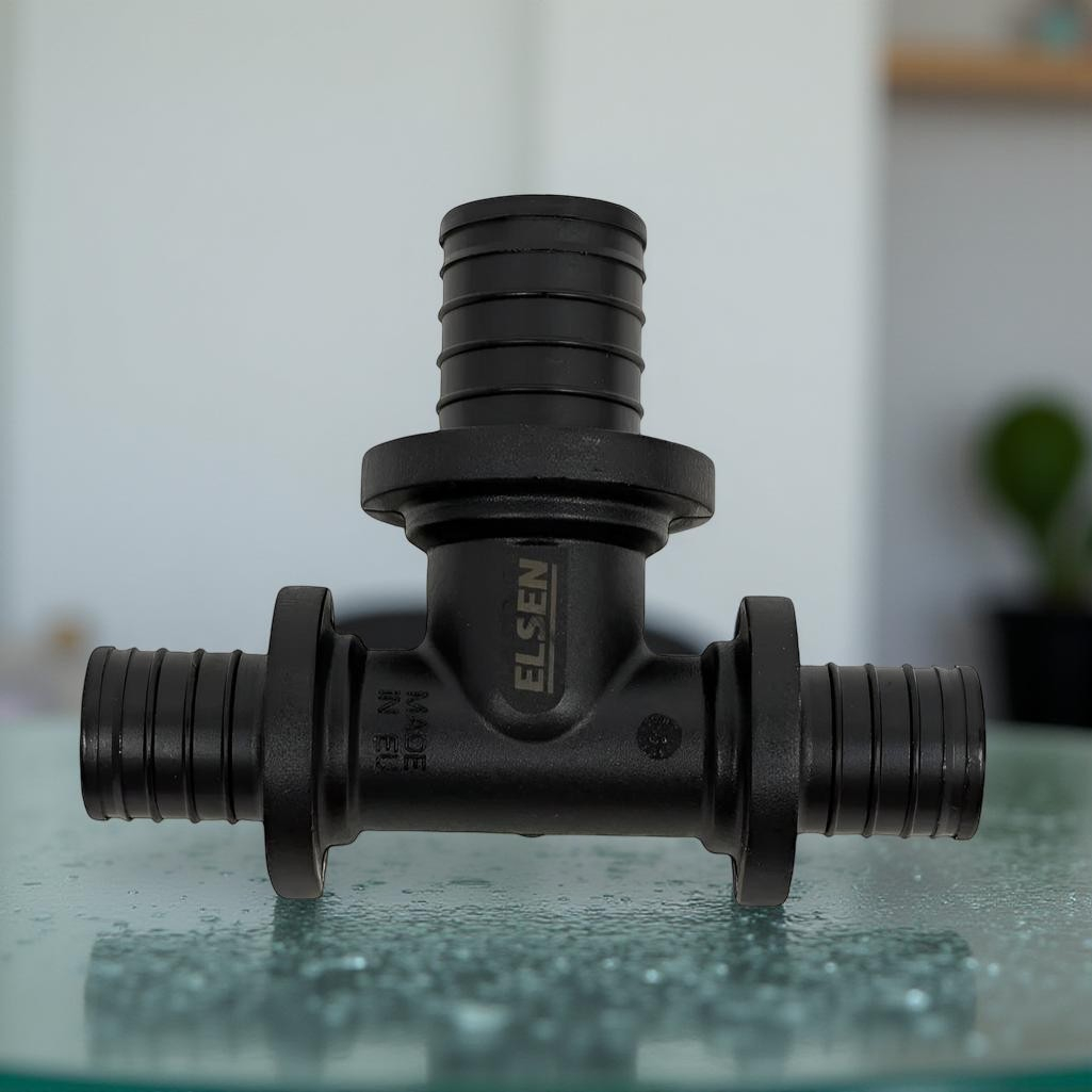 Тройник аксиальный Elsen EFA31.161616P, 16х16х16, равнопроходной, полимер имеет штуцерное соединение, фитинг применяется для соединения труб из сшитого полиэтилена или для разделения потока жидкости, циркулирующей в трубопроводе инженерной сети. Без данного фитинга нельзя организовать водопроводного, отопительного комплекса, поэтому при изготовлении тройника проявляется проверка надёжности с повышенными требованиями.