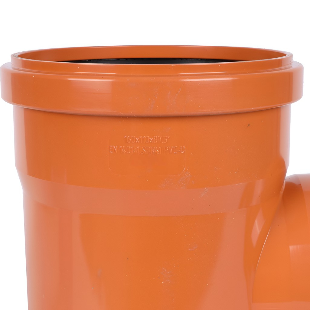 Тройник канализационный 87 гр. MagnaPlast 21330.R.B, диаметр 160х110 мм, красный — фасонная деталь для разветвления наружных канализационных систем. Предназначен для подключения труб диаметром 110 мм к магистральной линии 160 мм под углом 87 градусов.