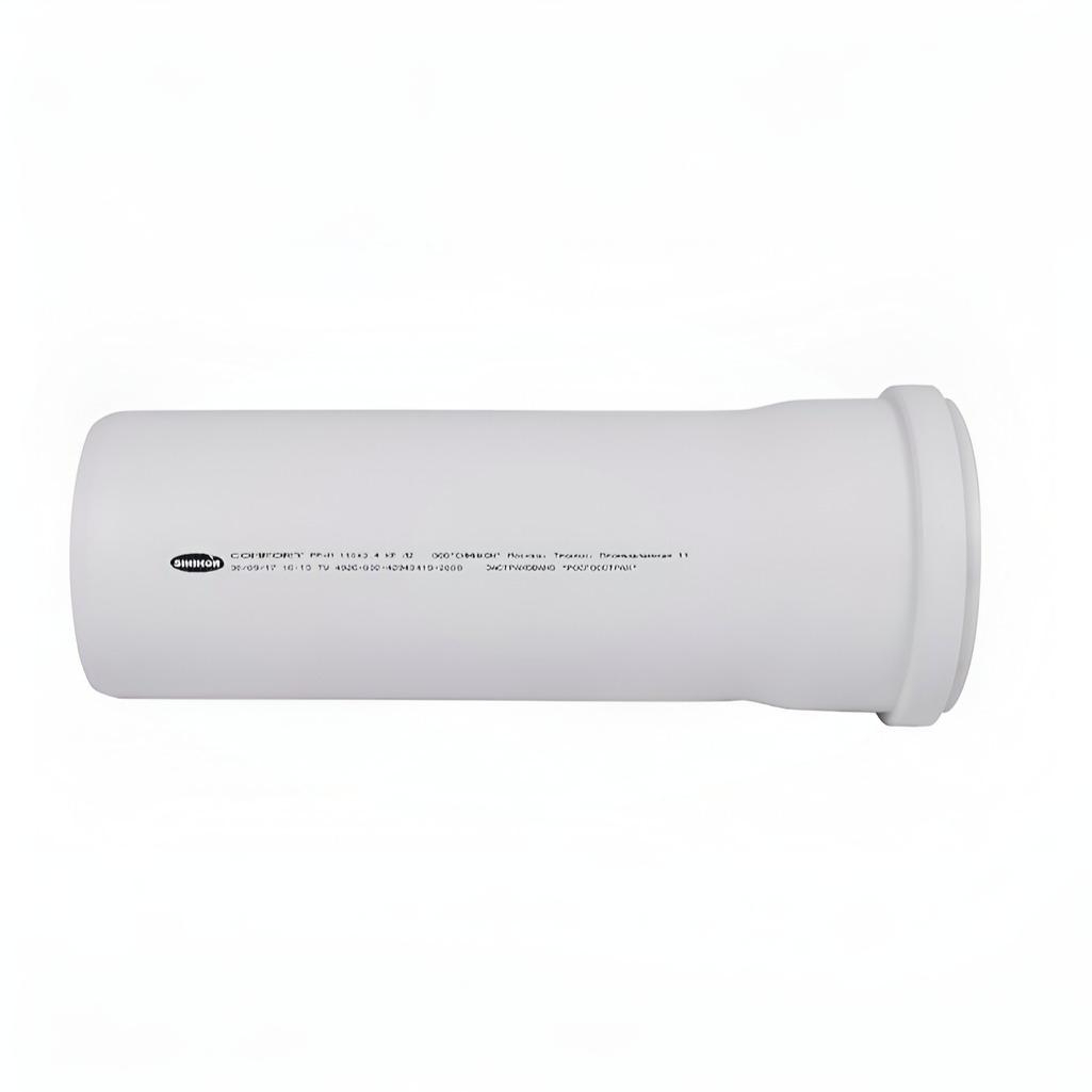 Труба канализационная Sinikon 500083, диаметр 110 мм, длина 250 мм, белая — короткий полипропиленовый патрубок для ремонтных вставок и соединений во внутренней канализационной системе. Изготовлена из термостойкого гомополимера пропилена (PP-H), устойчивого к высоким температурам стоков.
