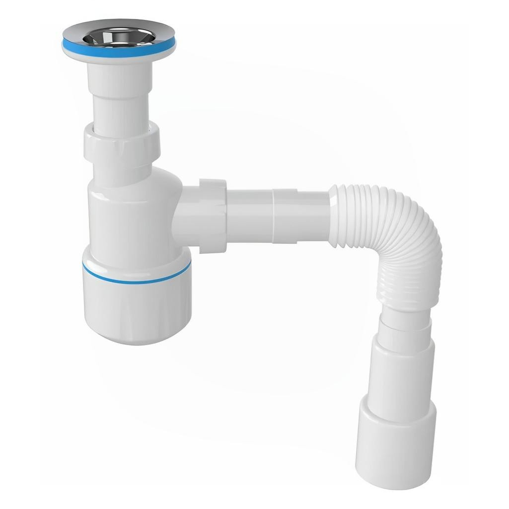 Сифон бутылочный Nova 1050 для раковины, выпуск 64 мм, 40/50-1 1/4", белый — сливная система для умывальников с увеличенным винтом. Оснащён выпуском 64 мм, винтом длиной 65 мм и гибкой выходной трубой 1¼"-40/50 мм для универсального подключения к канализации.