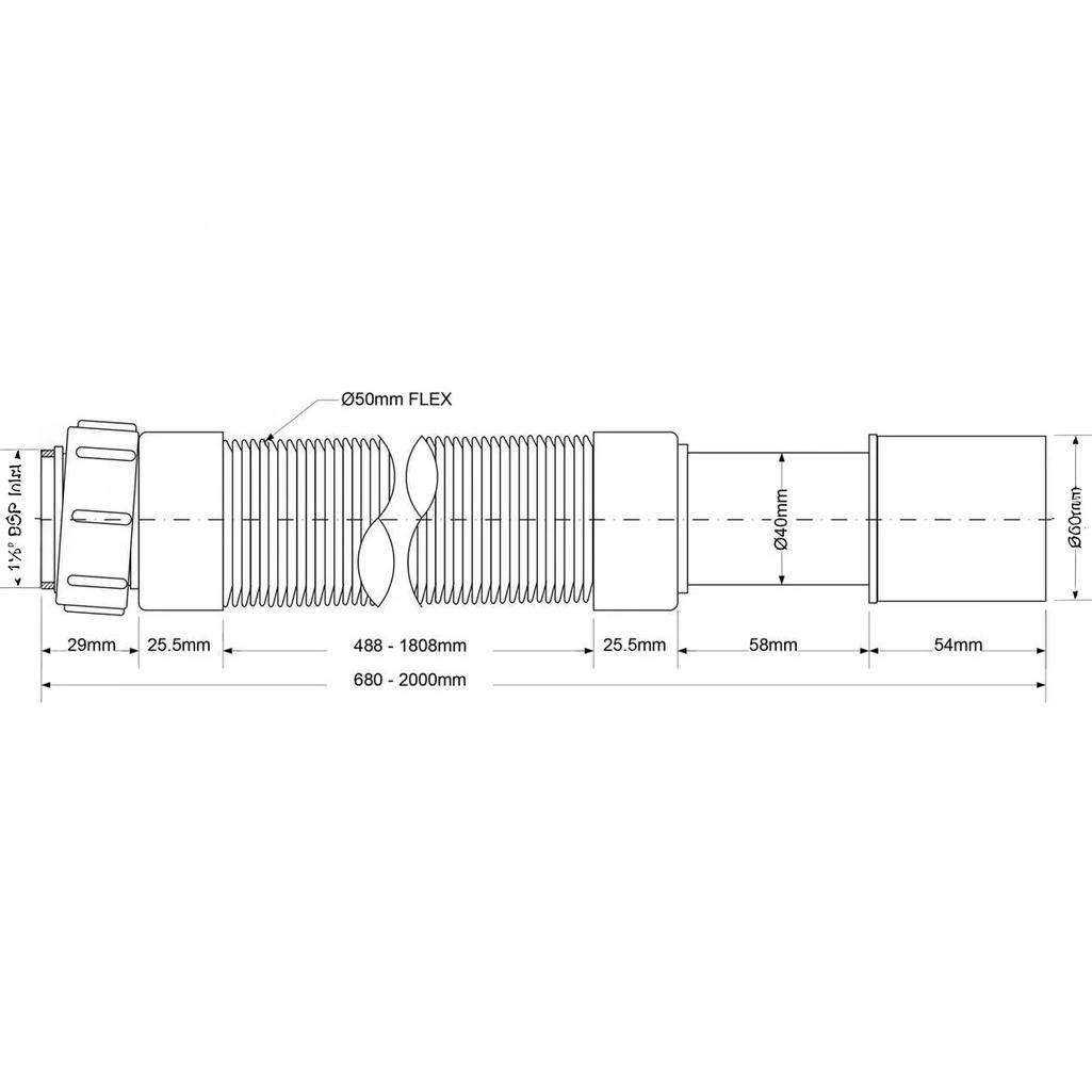 Труба гофрированная McAlpine MRMF 2-20 гибкая, раздвижная, вход 1 1/2", выход 40/50 мм, длина 2 м, белая гибкая для подключения сантехнических сифонов к системе канализации. Вход с резьбой 1½" подходит для стандартных сифонов, выход диаметром 40/50 мм соединяется с канализационным отводом. Увеличенная длина позволяет выполнять подключения на значительном расстоянии.
