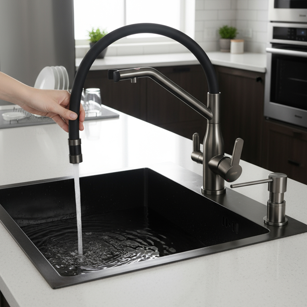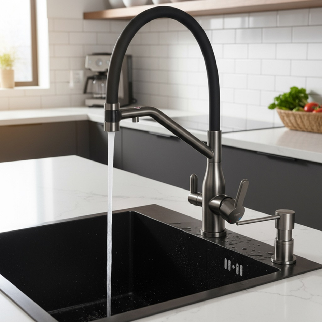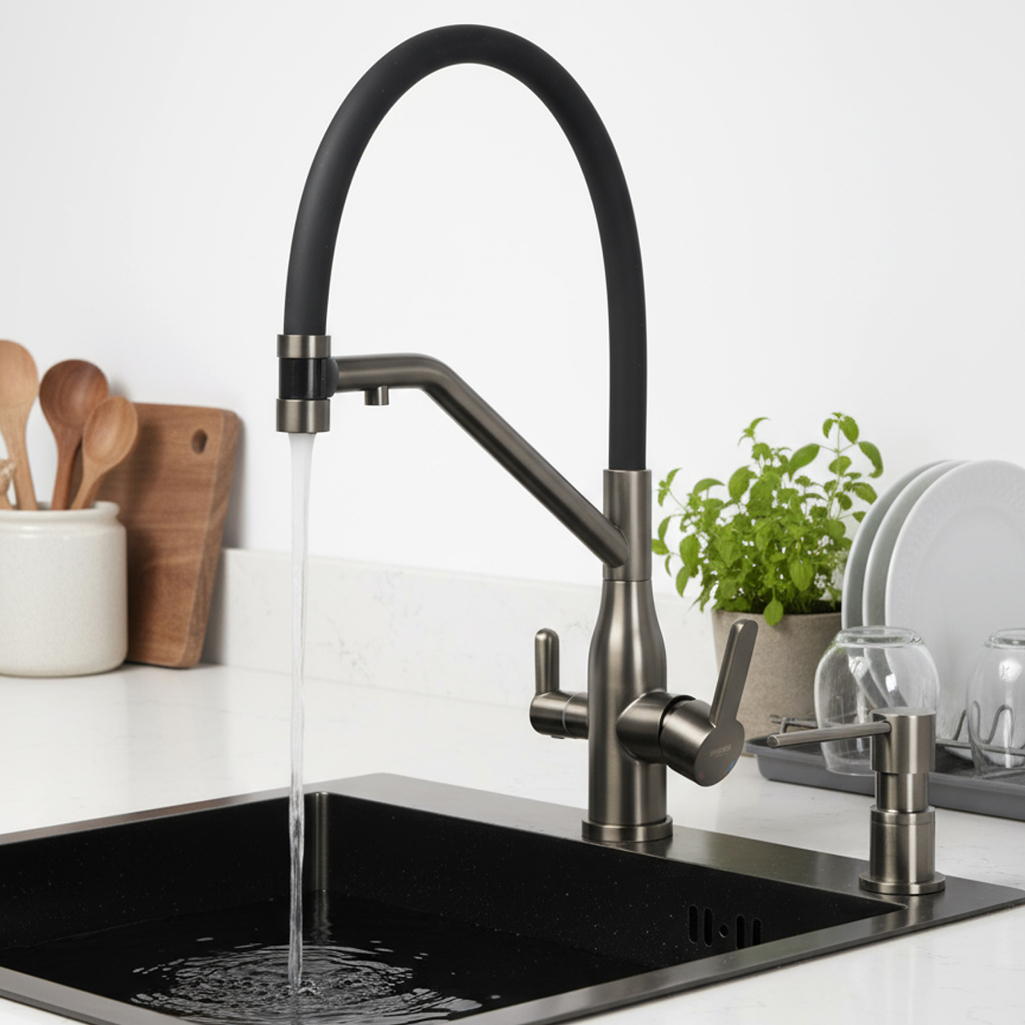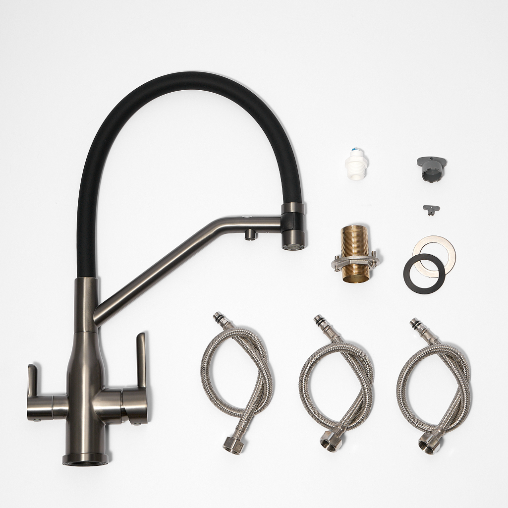 - Смеситель для кухни с подключением фильтра питьевой воды AETHERPRIDE A4398-89 (Оружейная сталь)