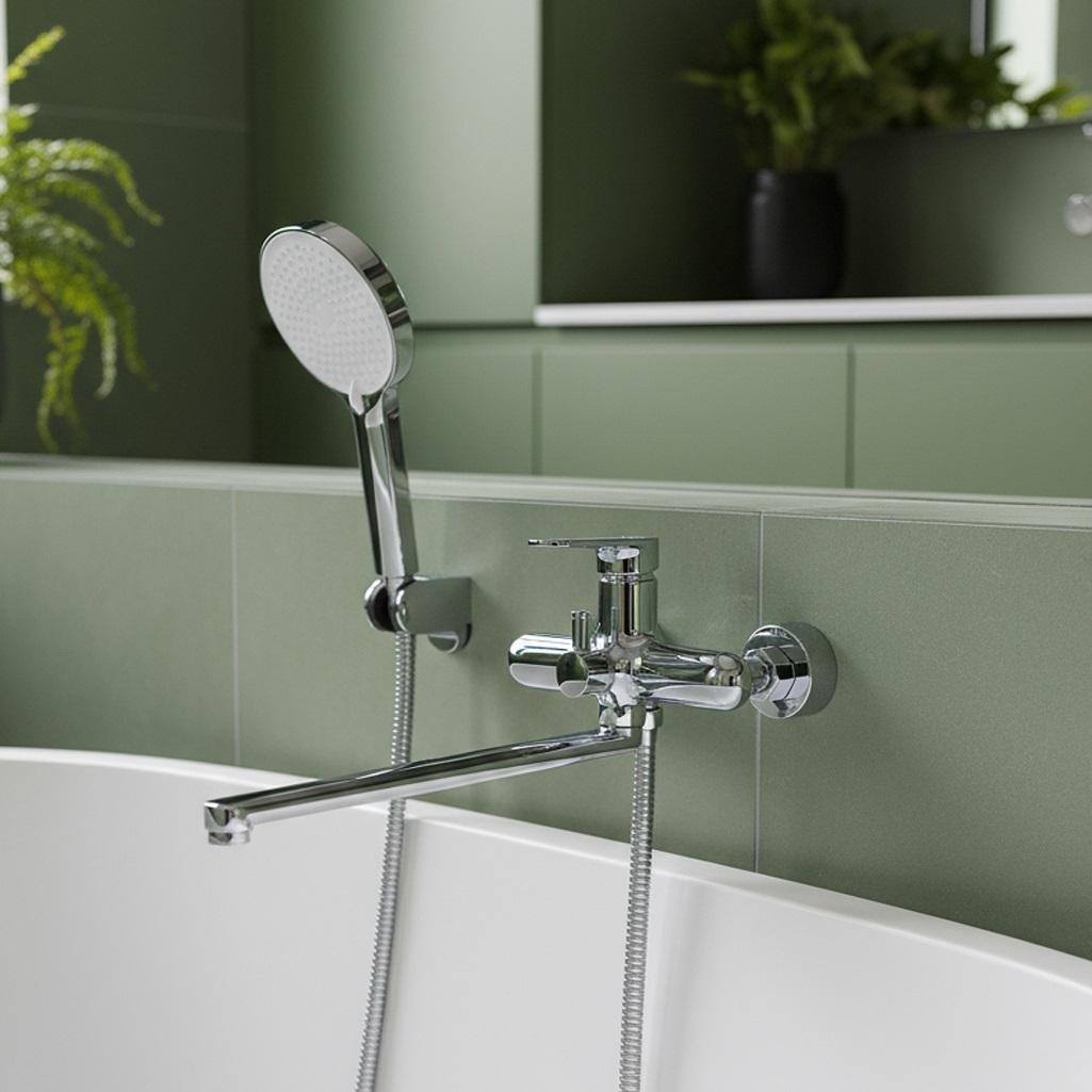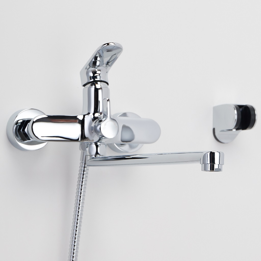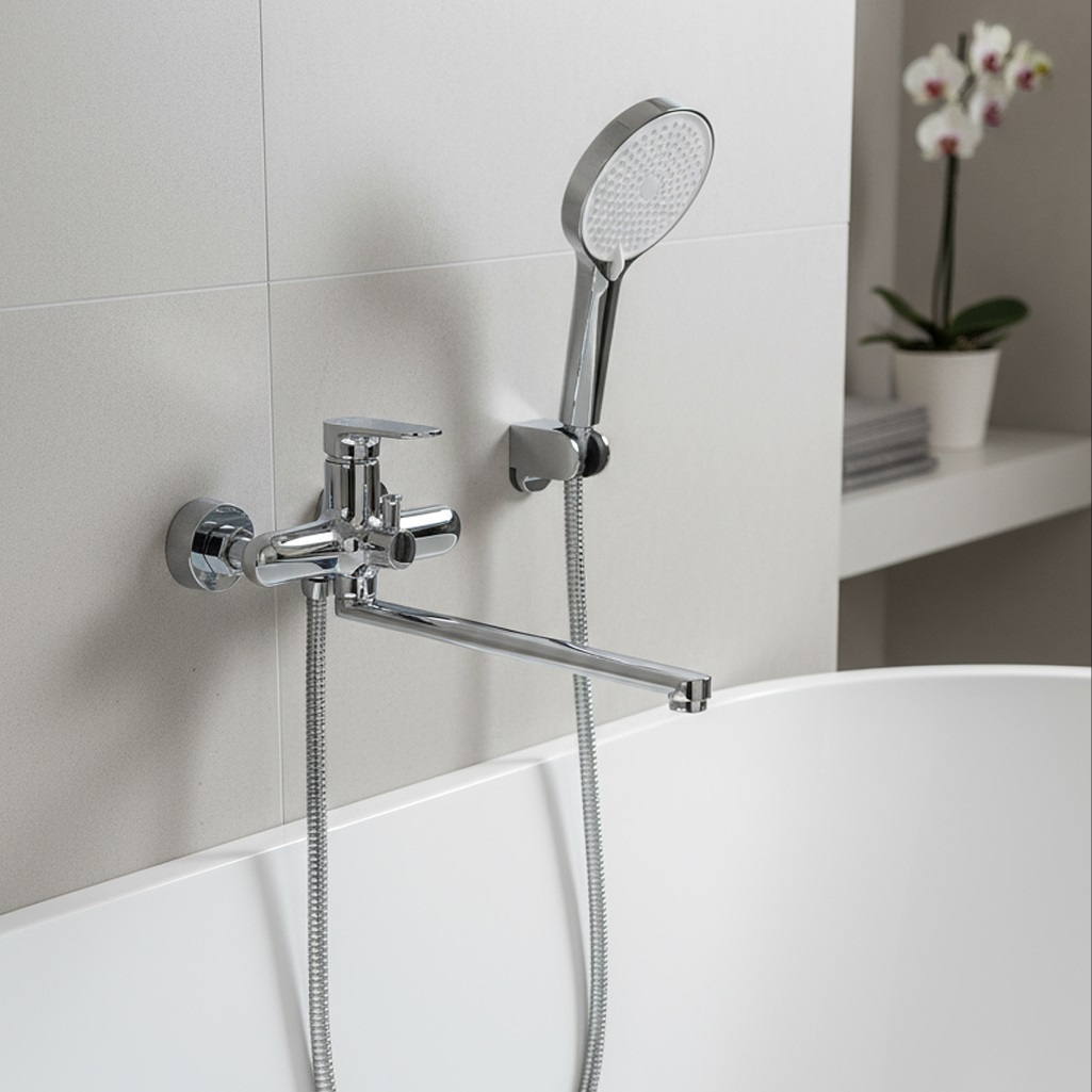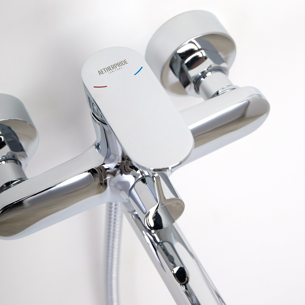 Смеситель для ванны AETHERPRIDE A2250, длинный излив, душевой гарнитур, цвет хром - это инновационное сантехническое устройство с утонченным дизайном и удобным рычажным механизмом управления. Смеситель оборудован керамическим картриджем, обеспечивающим точный контроль температуры и напора воды. Модель предназначена для настенного монтажа на 2 отверстия с жестким подключением 1/2". Благодаря современному дизайну и универсальности, этот смеситель станет стильным и функциональным дополнением любой ванной комнаты. Излив длинный, поворотный. Длина душевого шланга составляет 1450 мм.
