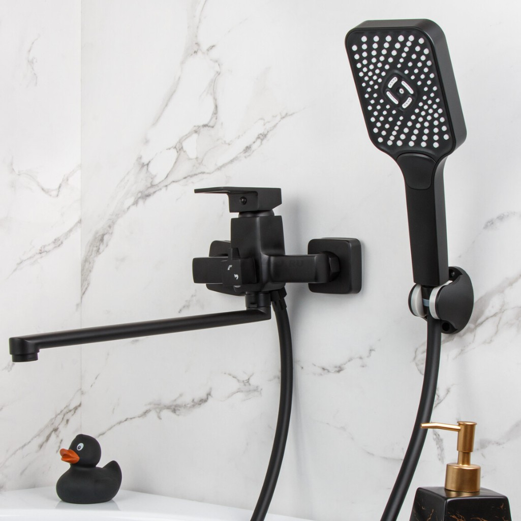 Смеситель для ванны Econoce EC0817BL картридж D35-A, с душевым гарнитуром, однорычажный, цинк, цвет черный предназначен для использования в ванной комнате. Этот стильный и функциональный аксессуар оснащен длинным поворотным L-изливом, который обеспечивает удобство использования. Смеситель выполнен из надежного цинка методом литья в песчаную форму. Полимерное покрытие придает ему элегантный и современный вид. Для монтажа смесителя используются эксцентрики. Картридж D35-A с запорным механизмом гарантирует долгий срок службы и стабильную работу. Рукоятка позволяет регулировать температуру и напор воды благодаря углу поворота в 25° по вертикали и 50° по горизонтали. Водосберегающий аэратор помогает фильтровать воду и насыщать её кислородом. Шланг выполнен из нержавеющей стали, лейка - из пластика.  Душевая лейка имеет 3 режима работы. Специальные эксцентрики упрощают и ускоряют монтаж смесителя на стену. Модель выполнена в брутальном черном цвете, что позволяет грамотно расставить акценты в интерьере ванной комнаты.