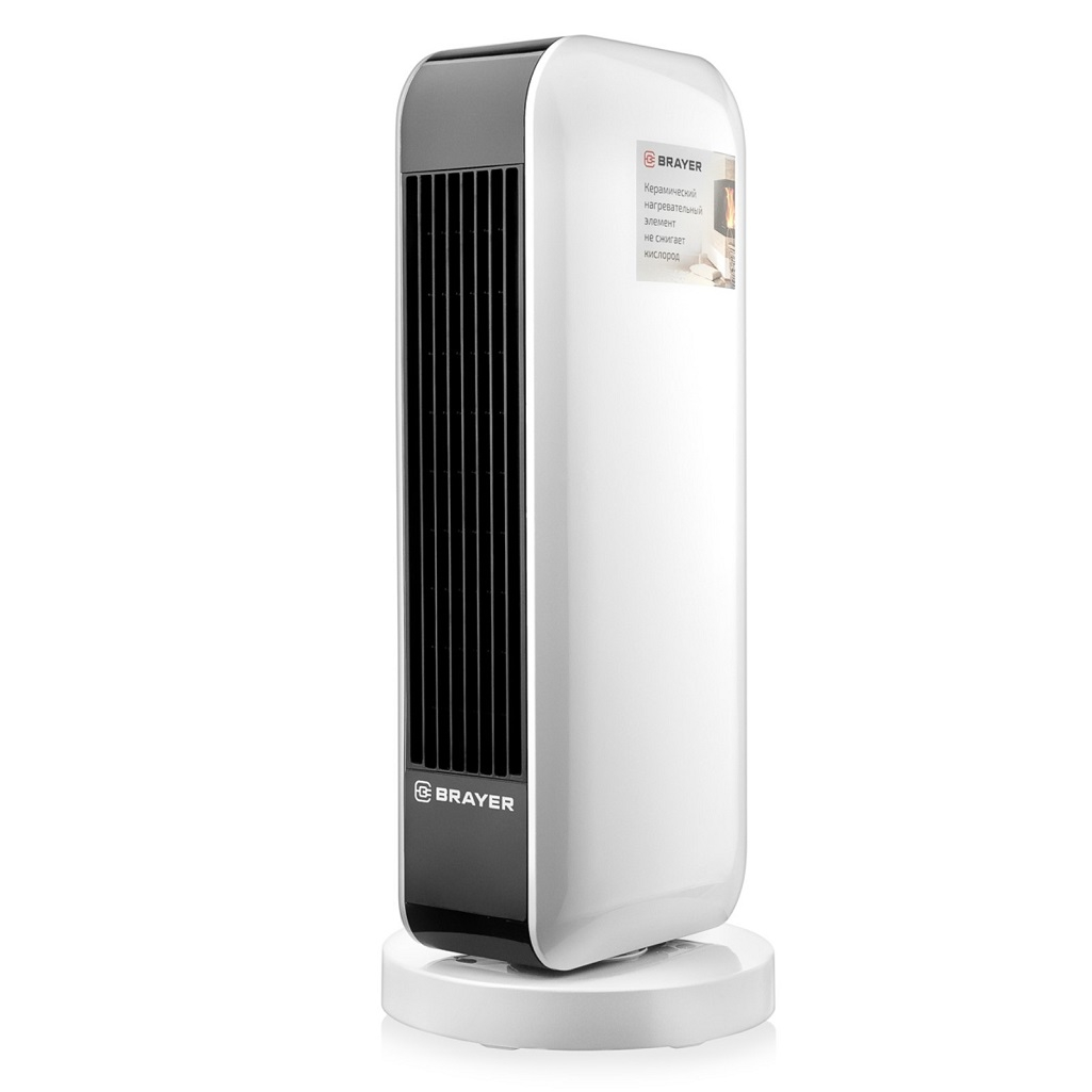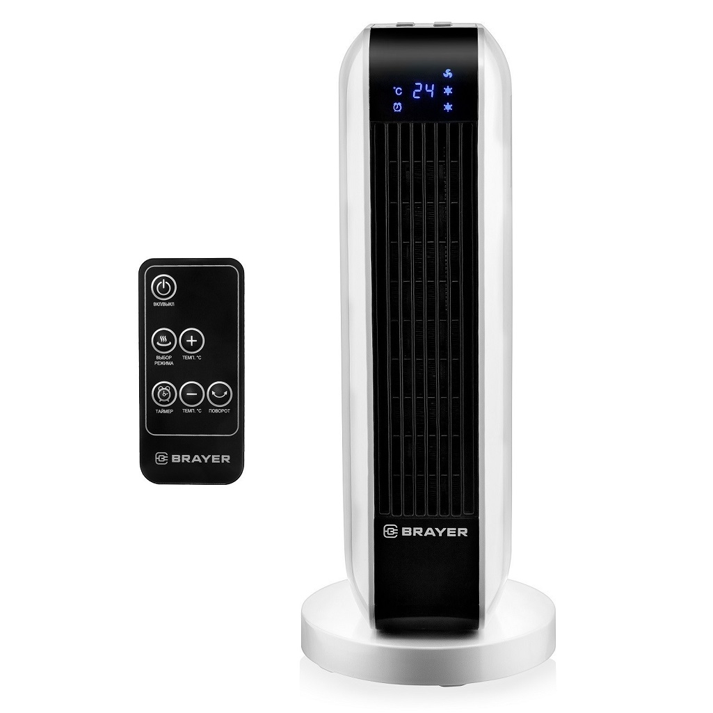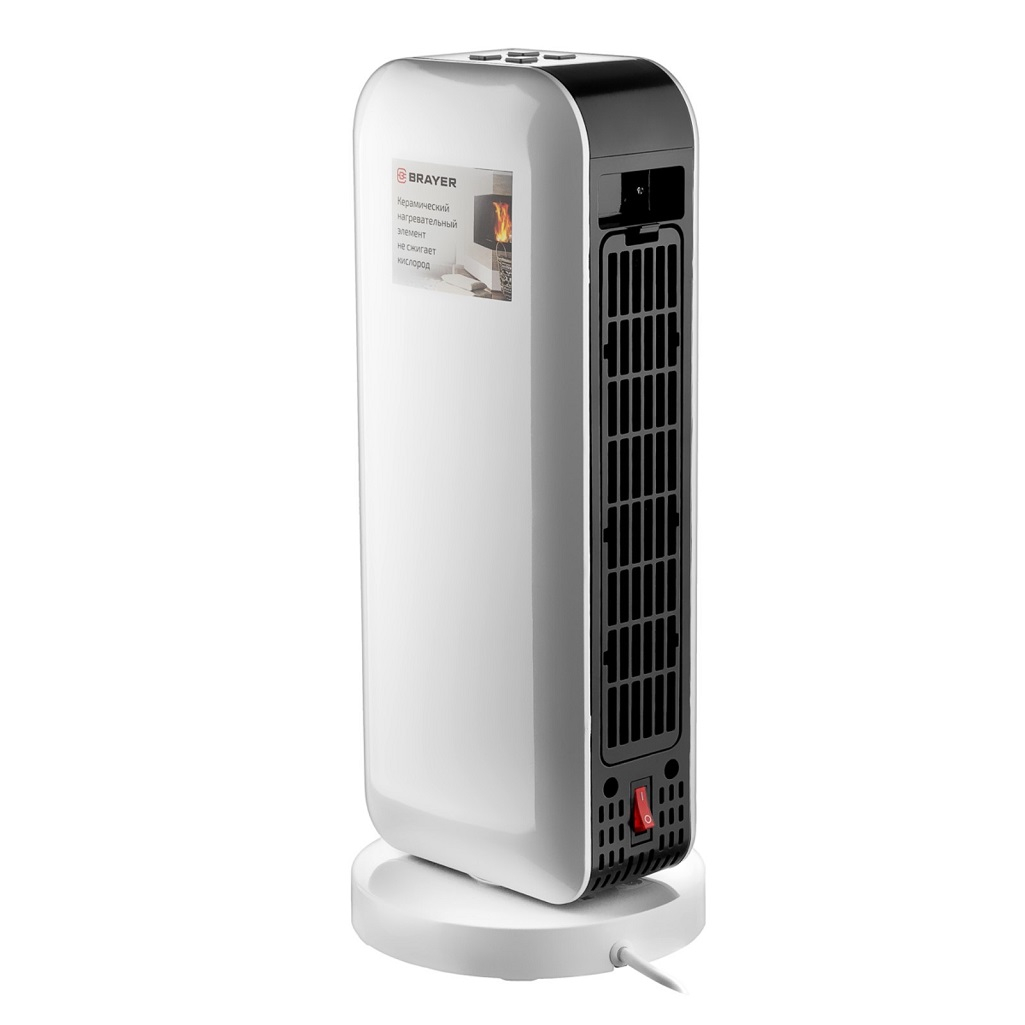 Керамический нагревательный элемент бережно нагревает воздух, не пересушивая его, не сжигая кислород и не поднимая пыль, тем самым поддерживая комфортный микроклимат в помещении. На экране отображается текущий режим работы. Также предусмотрена возможность установки таймера на период от 0,5 до 7,5 часов. Тепловентилятор имеет защиту от перегрева: функция автоматического отключения при превышении допустимой температуры нагрева делает агрегат безопасным для эксплуатации. В ситуации, если аппарат упадет на пол, сработает защита от опрокидывания, которая выключит тепловентилятор. В комплект поставки входит пульт дистанционного управления, благодаря которому взаимодействие с тепловентилятором Brayer 4802BR станет максимально комфортным и приятным.