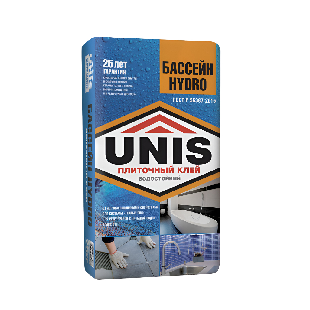 Клей плиточный Юнис Бассейн предназначен для укладки керамической, керамогранитной (не более 60х60 см) и мозаичной плитки, плит из природного камня в резервуарах для воды, на пол и стены в любых помещениях: влажных, сухих, промерзающих и отапливаемых. Для наружных работ (фасад, цоколь).