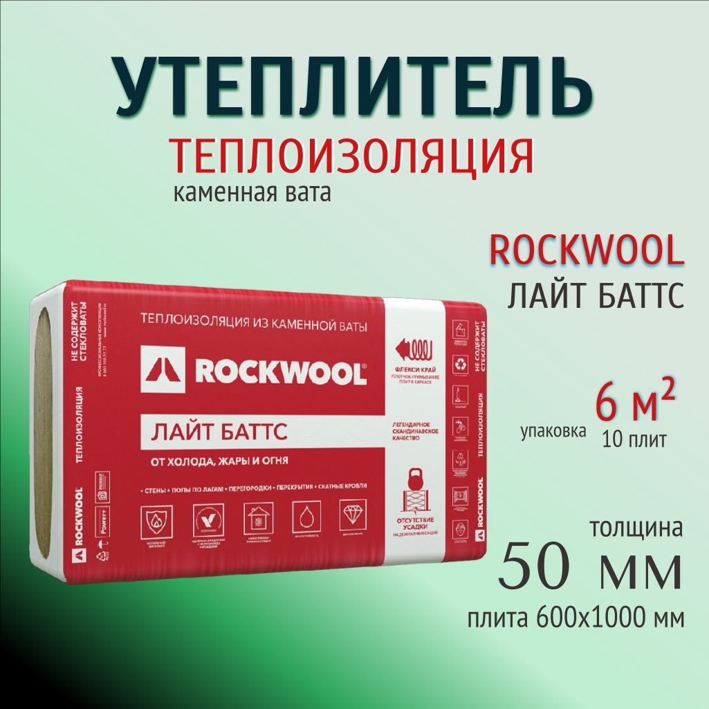 Утеплитель Rockwool Лайт Баттс для перекрытий, стен 50х600х1000 мм, 6 кв.м, 10 плит - это надежное решение для теплоизоляции, созданное на основе базальтовых пород. Он отличается легкостью, гидрофобностью и высокой эффективностью благодаря минеральной вате, которая обеспечивает качественное утепление. Продукт идеально подходит в качестве ненагружаемого теплоизоляционного слоя в различных конструкциях, таких как перегородки, межэтажные перекрытия, стены малоэтажных зданий, включая вертикальные и наклонные стены мансард.