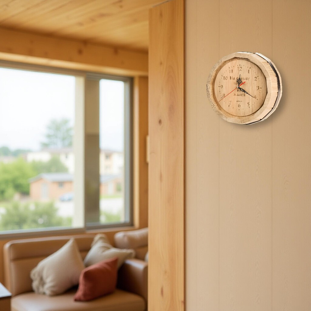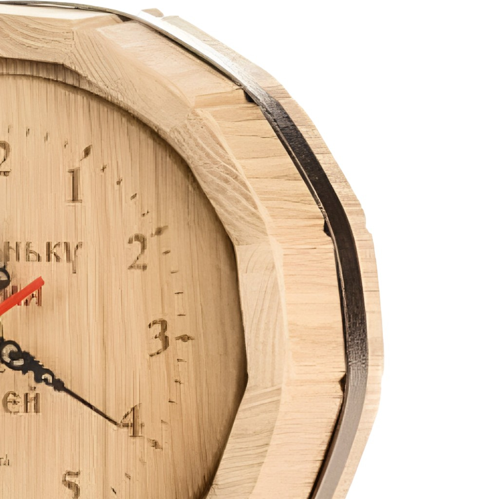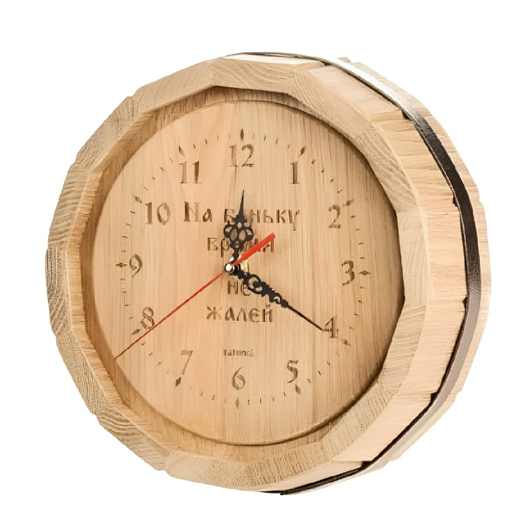 Часы круглые, ЧПД-2 На баньку время не жалей, Дуб, для бани и сауны, настенные, 85х260 мм, бондарные, дерево предназначены для установки в предбаннике. Часы выполнены из дуба, который прекрасно переносит перепады температур и повышенную влажность, характерные для бани. Дизайн модели оправдывает свое название - бондарные часы, поскольку изделие выполнено в стиле бочки, кадки. Деревянный корпус надежно защищает часовой механизм от повреждений. Механизм часов рассчитан на длительную эксплуатацию в условиях высокой влажности и температурных колебаний. Особое внимание привлекает уникальный дизайн, полностью соответствующий банной тематике, с пословицей-пожеланием "На баньку время не жалей".