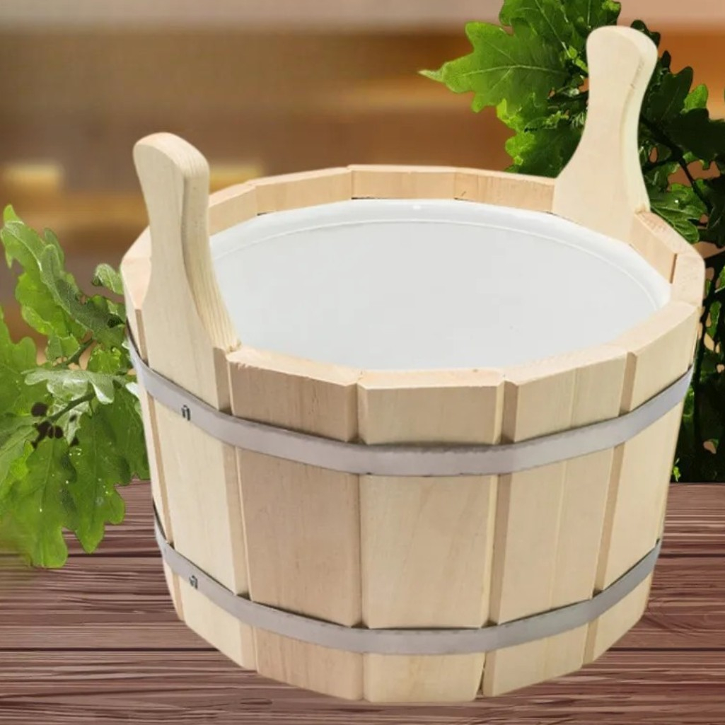 Описание шайки для бани и сауны, R-SAUNA ПЛ-14, объем 12 л, Липа, вставка из пластика, дерево