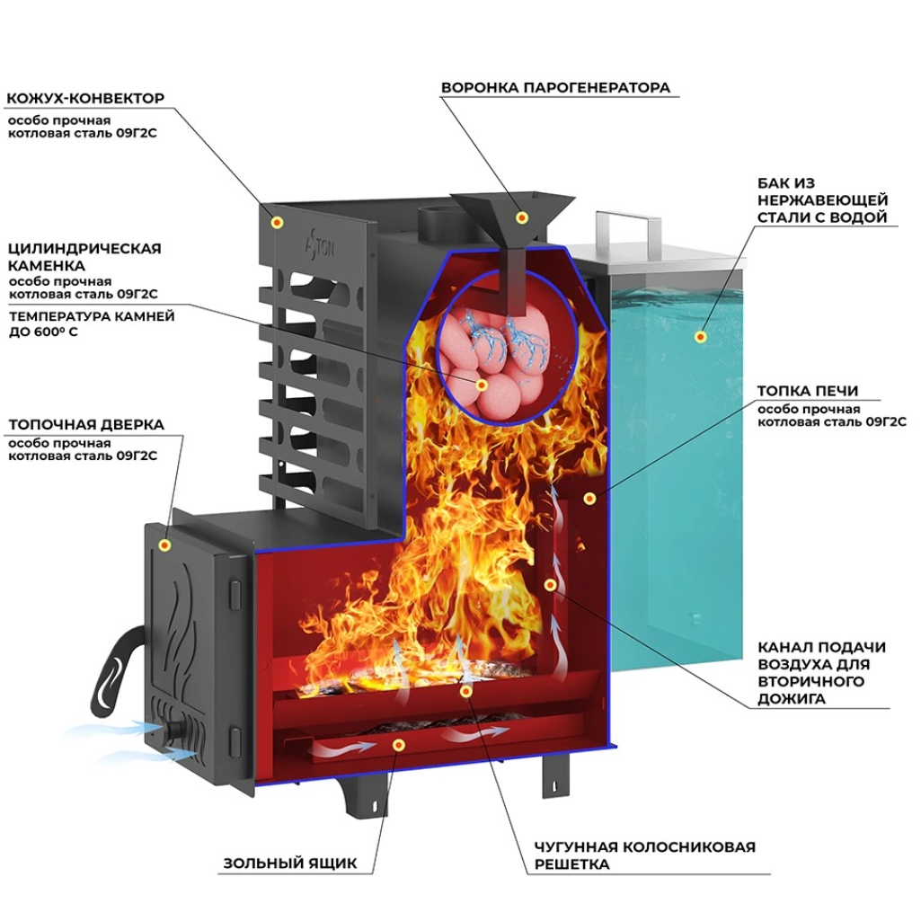 Описание печи Aston 16 Аква, дверца глухая, 16 кВт, d115, до 18 куб.м