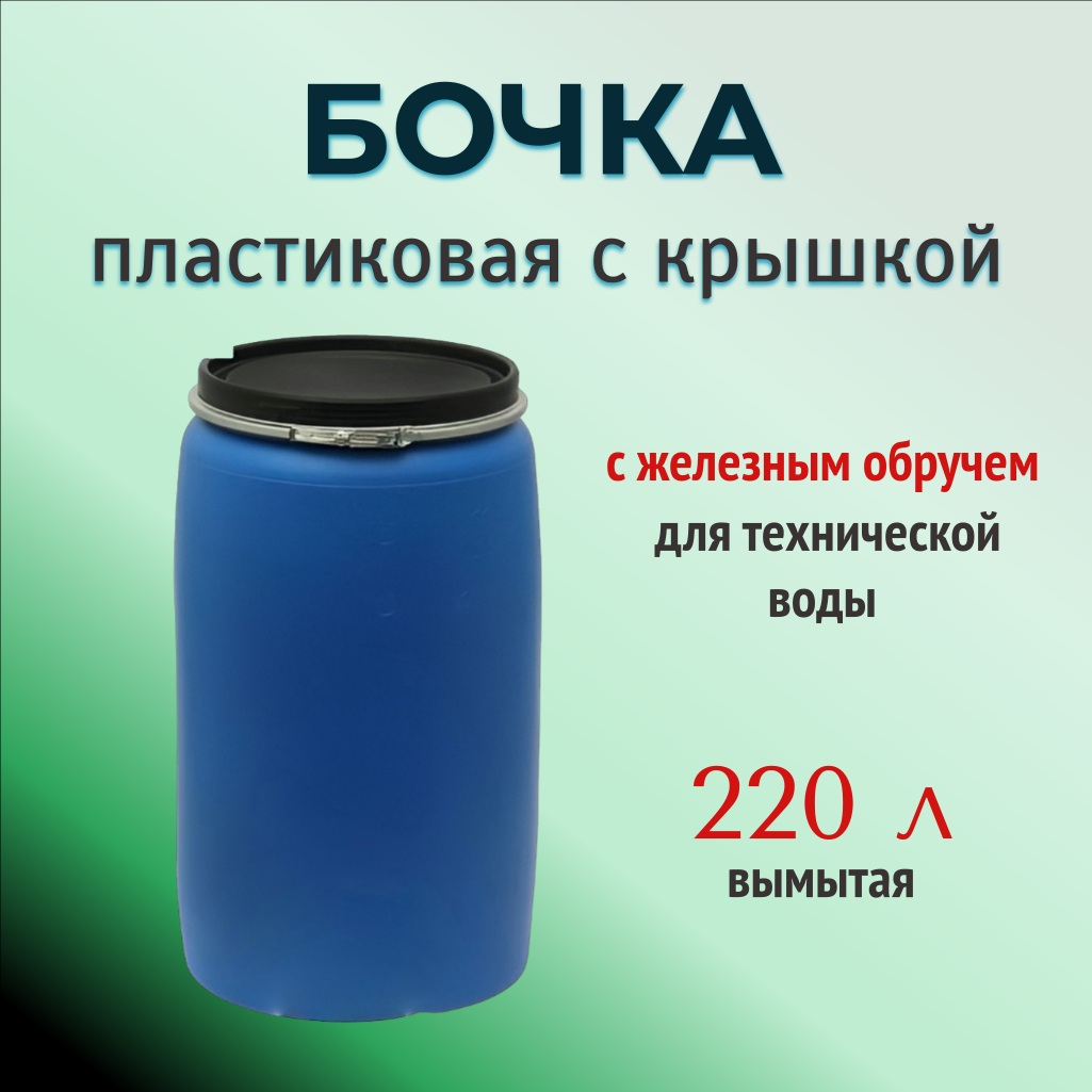 Бочка 220 литров, вымытая, полиэтиленовая, с крышкой на железном обруче, синяя — чистая, вымытая бочка из полиэтилена объемом 220 литров, готовая к использованию. Предназначена для технических целей: на дачных участках, в банях, при устройстве душей, для сбора и хранения воды под полив. Съемная пластиковая крышка надежно фиксируется металлическим обручем.