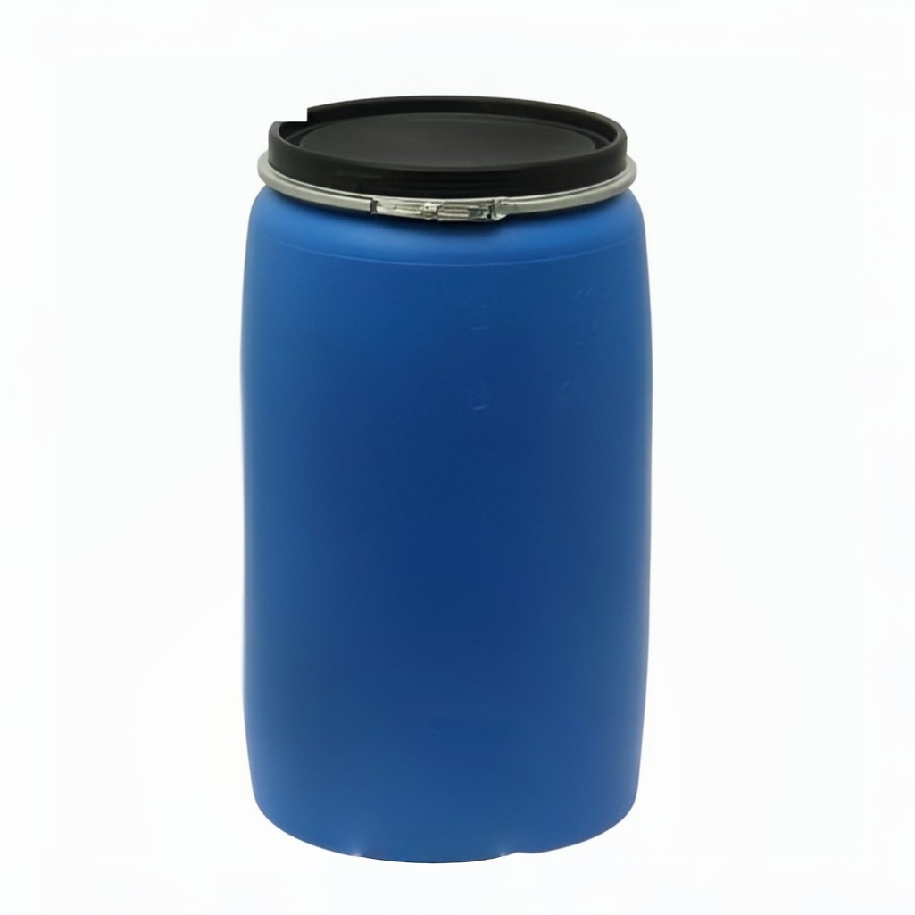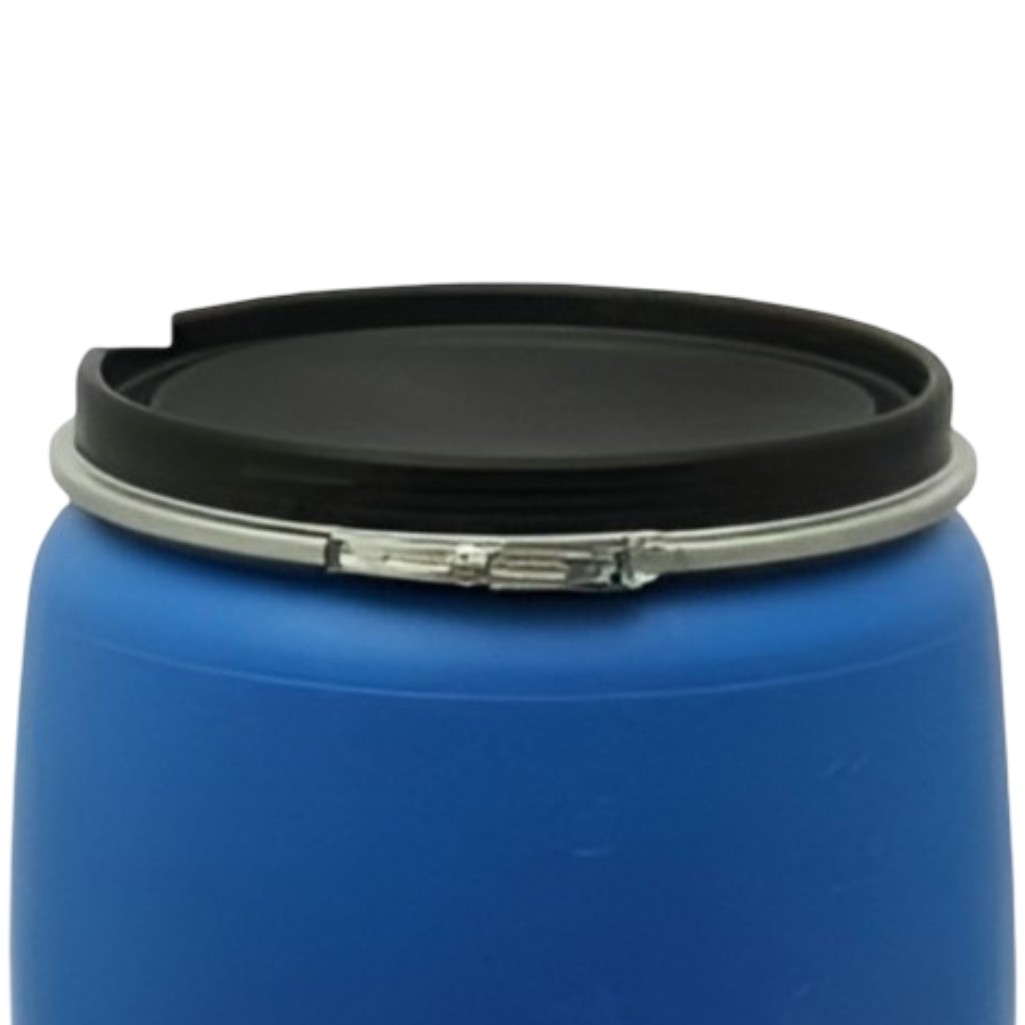 Описание бочки 220 литров, вымытая, полиэтиленовая, с крышкой на железном обруче, синяя