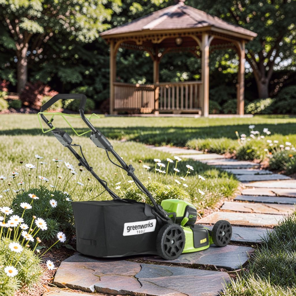 Травосборник 55 л _ это большой объем, который уменьшает частоту остановок для очистки. Мульчирование и боковой выброс - это выбор удобного режима работы. Задние колеса увеличенного размера обеспечивают лучшую проходимость по неровному рельефу. Прочный пластик и металлический дек выполнены из качественных материалов. Совместимость с другими инструментами Greenworks 60В обеспечивается аккумуляторной батареей, которую можно использовать для разных устройств данного производителя.