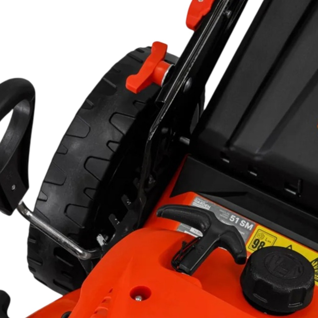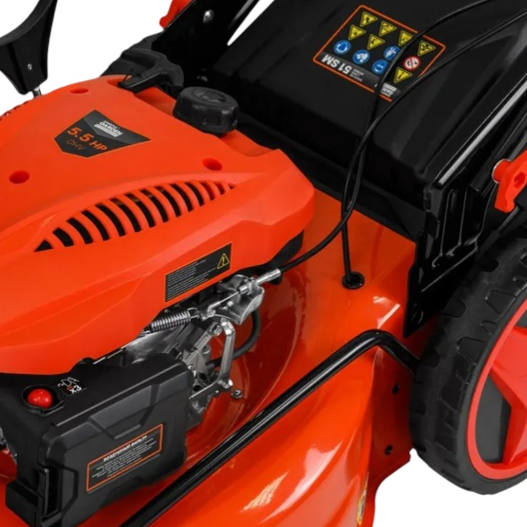 Газонокосилка бензиновая Startul Garden 51 SM самоходная, травосборник 70 л, 4000 Вт - это современная самоходная газонокосилка, созданная для профессионального ухода за вашим газоном. Благодаря мощному четырехтактному бензиновому двигателю, устройство обеспечивает высокую производительность и надежность при работе. Удобство использования достигается за счет самоходного механизма, который позволяет легко перемещаться по участку без дополнительных усилий. Централизованная регулировка высоты скашивания дает возможность адаптировать работу под различные типы травы и условия. Универсальность применения обеспечивается благодаря четырем режимам работы: сбор травы в травосборник, боковой и задний выброс, а также функция мульчирования. Это позволяет выбрать оптимальный способ обработки газона в зависимости от ваших потребностей. Проходимость и маневренность обеспечены большими колесами разного диаметра, что делает газонокосилку идеальной даже для участков с неровным рельефом. Штуцер для подключения шланга значительно упрощает очистку деки после работы, а складная рукоятка делает хранение и транспортировку максимально удобными. Практичность конструкции дополняется вместительным травосборником, который позволяет работать длительное время без перерывов на его очистку. Черный корпус с бордовыми акцентами придает устройству современный и стильный вид.