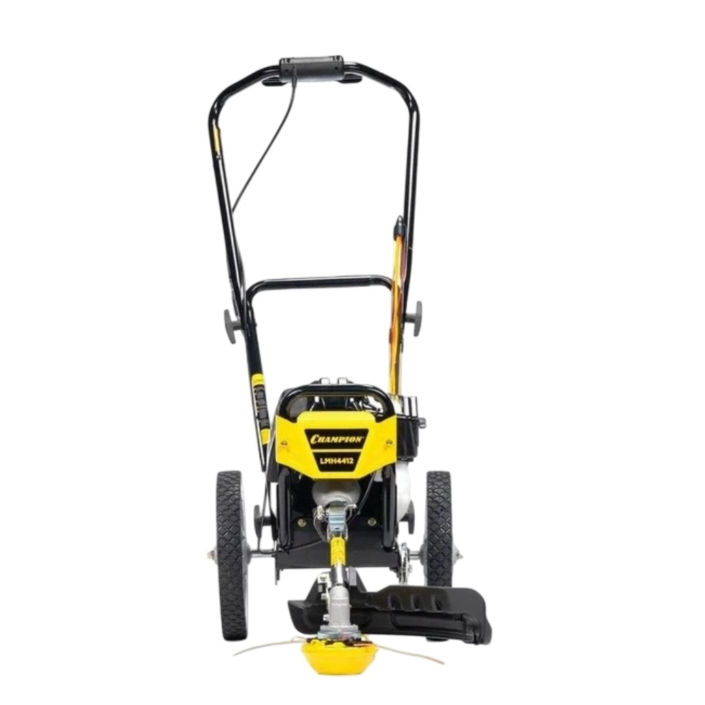 Газонокосилка CHAMPION LMH 4412 оснащена безремённой передачей крутящего момента с помощью стального углового редуктора, заимствованного у обычных бензиновых кос. На основании редуктора установлен широкий защитный кожух, предотвращающий попадание летящей травы на оператора. Колесная тележка с колесами большого диаметра обеспечивает плавный ход и отличную проходимость по высокой траве. Модель также оборудована центробежным сцеплением в виде муфты, благодаря которому режущий элемент остается неподвижным при работающем двигателе до тех пор, пока оператор не нажмет на ручку газа. Двухтактный двигатель позволяет использовать газонокосилку на склонах.