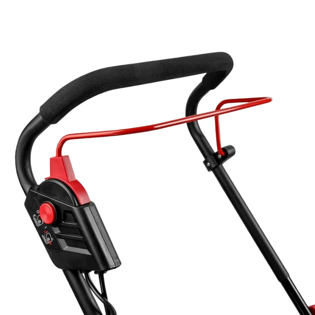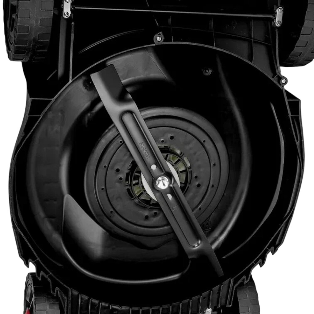 Бесщеточный двигатель данной модели обладает рядом преимуществ перед своими щёточными аналогами. Во-первых, он демонстрирует более высокий коэффициент полезного действия. Во-вторых, его срок службы значительно увеличен благодаря отсутствию износа щёток. Кроме того, он обеспечивает стабильную мощность на всех режимах работы, что делает его надёжным в эксплуатации. Двигатель также меньше нагревается при длительной работе, что способствует его долговечности. Наконец, он потребляет меньше энергии при сохранении той же производительности, что делает его более экономичным в использовании. Дека выполнена из пластика. Рукоятка складная, эргономичная, с мягкими накладками, благодаря которым снижается вибрация и работа с агрегатом становится комфортной. Колеса большого диаметра (передние - 240 мм, задние - 170 мм) обеспечивают лучшую проходимость на пересеченной местности, склонах и газонах с неровностями, уменьшают риск застревания и повышают маневренность.