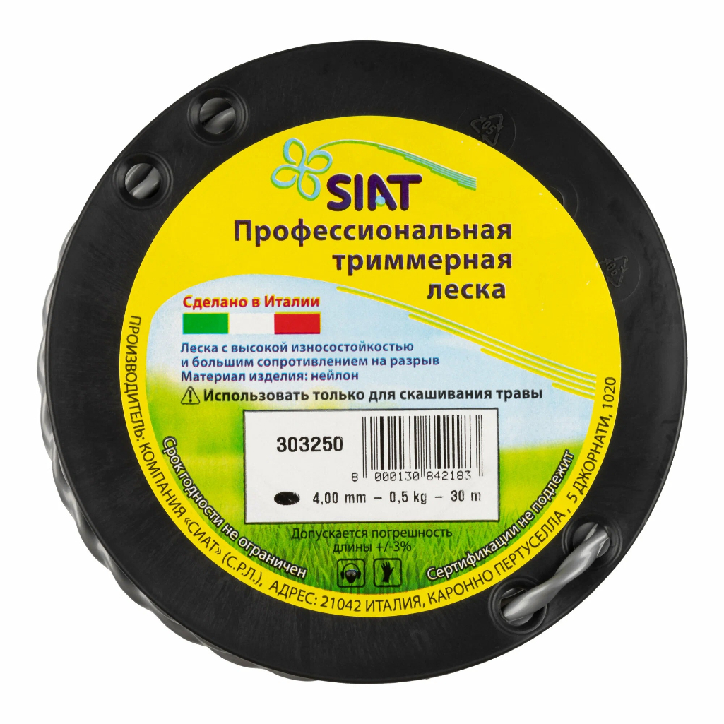 Леска для триммера SIAT Challenge 303250, диаметр 4.0 мм, длина 30 м, крученый эллипс - это профессиональная леска, которая имеет очень высокую износостойкость и большое сопротивление на разрыв. Леска подходит к любому типу триммеров. Высокая степень износостойкости, эффективная работа при высоких температурах и нагрузках, единый диаметр на всю длину нити и насыщенный цвет выделяют эту леску из многообразия вариантов. Форма эллипс еще называется овальная или витой овал. Необходимо правильно подбирать леску по основным характеристикам, потому что нужный вариант лески и ее сечения для определенных работ существенно влияет на скорость кошения и износ лески. Приобретайте этот высококачественный товар и наслаждайтесь лёгким и эффективным уходом за вашим садом.