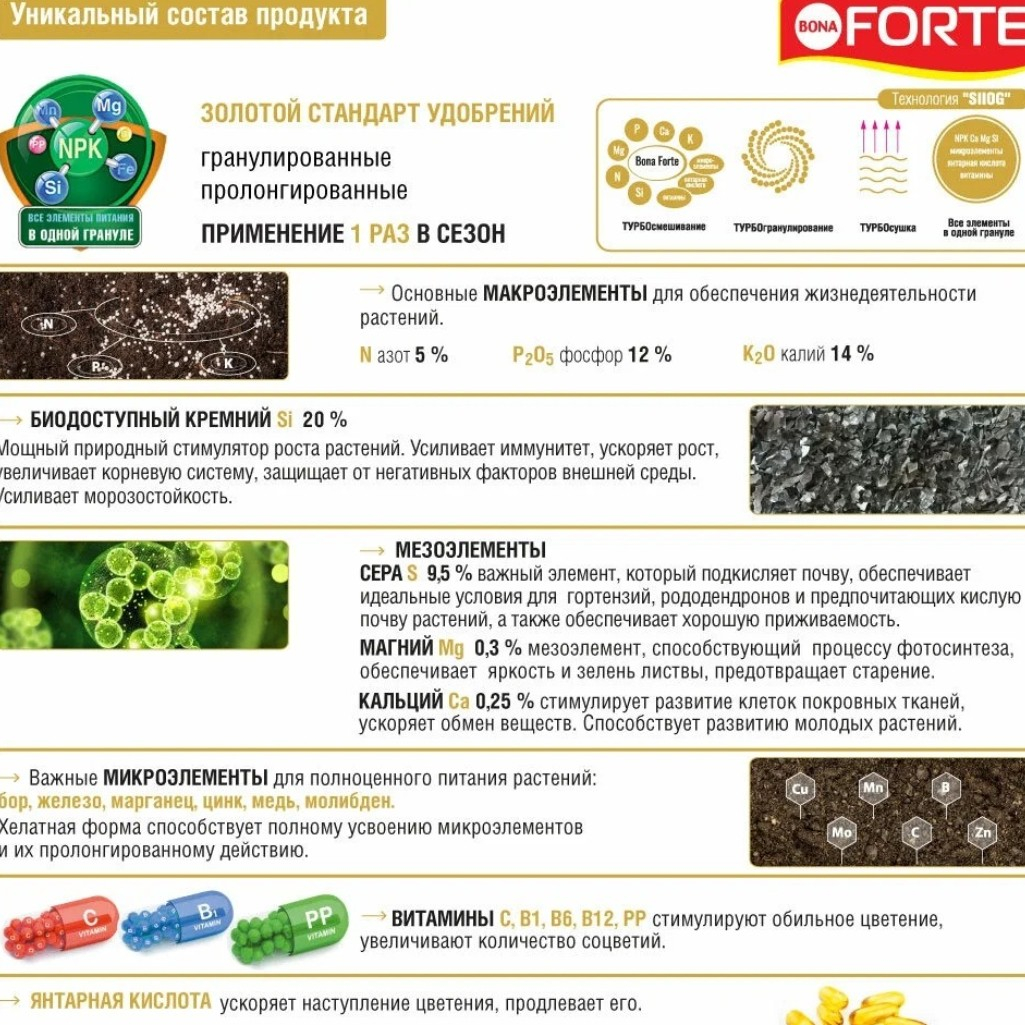 Удобрение Bona Forte для гортензий, рододендронов и предпочитающих кислую почву, пролонгированное, 2.5 кг произведено по уникальной передовой технологии SIIOG, обеспечивающей важные качественные преимущества перед традиционным смешением. Благодаря содержанию всех компонентов в одной грануле гарантированно обеспечивается каждым элементом питания.